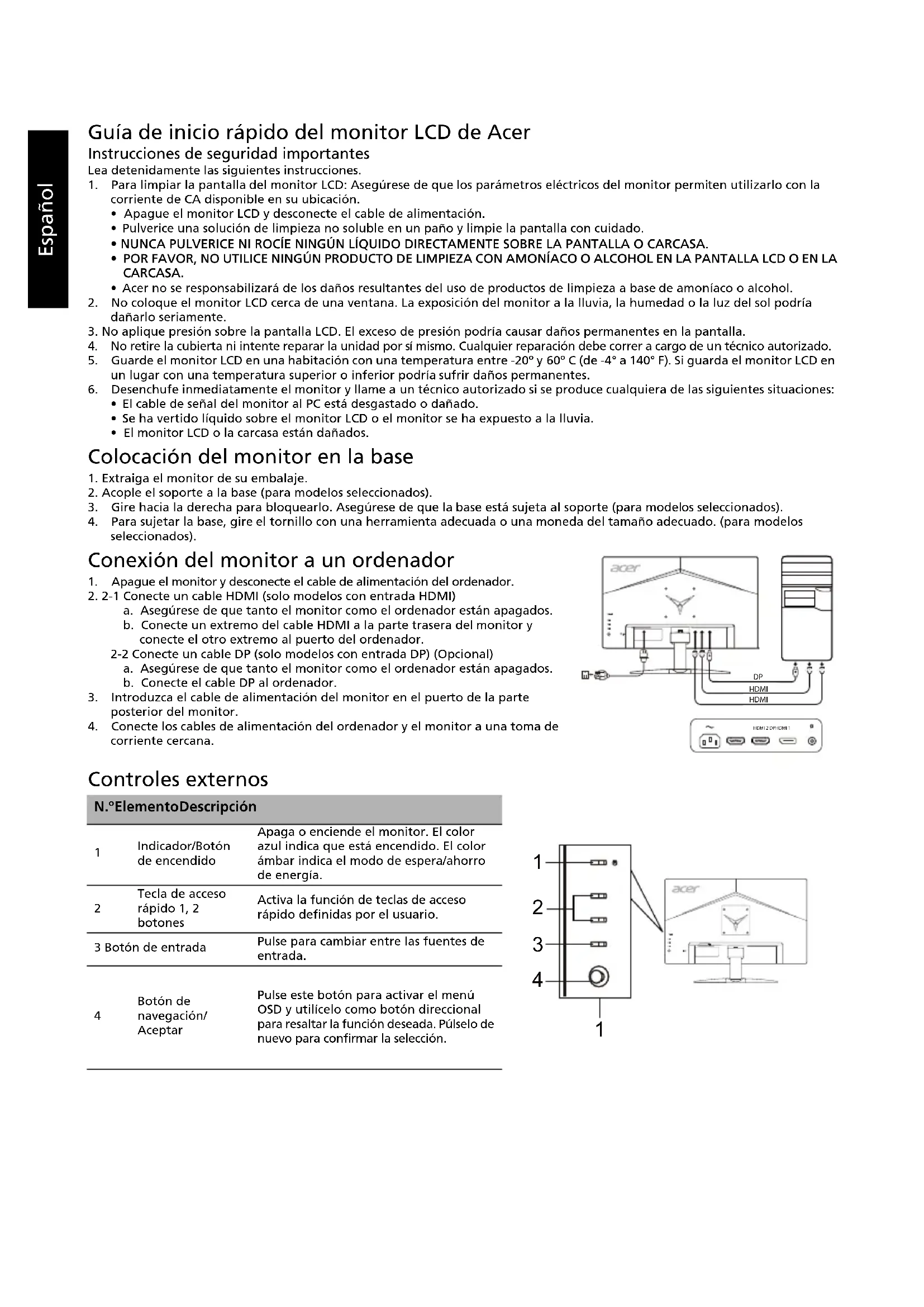 4Español Normativa y avisos de seguridad Aviso de la FCC Este dispositivo se ha probado y comprobado que cumple con los límites para un dispositivo digital de Clase B conforme a la Parte 15 de las normas de la FCC. Estos límites están diseñados para proporcionar una protección razonable frente a interferencias dañinas en una instalación residencial. Este dispositivo genera, utiliza y puede irradiar energía de radiofrecuencia y, si no se instala ni utiliza conforme a las instrucciones, podría causar interferencias dañinas en las comunicaciones de radio. No obstante, no puede garantizarse que las interferencias no se produzcan en instalaciones concretas. Si este dispositivo causa interferencias dañinas en la recepción de radio o televisión, lo que puede determinarse apagando y encendiendo el dispositivo, el usuario puede intentar solucionar las interferencias de las siguientes maneras: Cambiar la orientación de la antena receptora o colocarla en otro lugar. Aumentar la separación entre el dispositivo y el receptor. Conectar el dispositivo a una toma de corriente en un circuito distinto al que se ha conectado el receptor. Consulte con el distribuidor o un técnico especializado en radio y televisión para recibir asistencia. Declaración de conformidad CE Por la presente, Acer Inc. declara que este monitor LCD cumple con los requisitos y otras provisiones relevantes de la directiva EMC 2014/30/EU, la directiva de bajo voltaje 2014/35/EU, la directiva RoHS 2011/65/EU y la directiva 2009/125/EC relacionadas con la creación de un marco para el establecimiento de requisitos de ecodiseño para productos relacionados con la energía. Aviso: Para evitar daños en el monitor, no lo levante sujetándolo por la base. Aviso: Cables blindados Las conexiones a otros dispositivos informáticos deben realizarse con cables blindados, a fin de cumplir con las normativas de la EMC. Aviso: Dispositivos periféricos Solo deben conectarse a este equipo aquellos periféricos (dispositivos de entrada/salida, terminales, impresoras, etc.) certificados que cumplan con los límites de la Clase B. Si se utiliza con periféricos sin certificación, es posible que se produzcan interferencias en la recepción de radio y televisión. Precaución Cualquier cambio o modificación no aprobado expresamente por el fabricante podría anular la autoridad del usuario, concedida por la Comisión Federal de Comunicaciones, para utilizar el producto. Condiciones de funcionamiento Este dispositivo cumple con la Parte 15 de las normas de la FCC. El funcionamiento está sujeto a las siguientes condiciones: (1) este dispositivo no puede causar interferencias dañinas y (2) este dispositivo debe aceptar cualquier interferencia recibida, incluidas aquellas que puedan provocar un funcionamiento no deseado. Aviso: Usuarios de Canadá Este aparato digital de Clase B cumple con la normativa CAN ICES-003(B)/NMB-003(B). Remarque à l'intention des utilisateurs canadiens Cet appareil numérique de la classe B est conforme à la norme NMB-003 du Canada. Eliminación de equipo obsoleto por parte de los usuarios en una vivienda privada en la Unión Europea La aparición de este símbolo en el producto o su embalaje indica que no es posible eliminarlo con el resto de residuos domésticos. En su lugar, el usuario es responsable de eliminar el equipo obsoleto llevándolo a un punto de recogida designado para el reciclaje de equipo eléctrico y electrónico. El reciclaje y la recogida por separado del equipo obsoleto en el momento de su eliminación ayudarán a conservar los recursos naturales y garantizar que se recicla de una forma que proteja la salud humana y el medio ambiente. Para obtener más información sobre dónde puede llevar su equipo obsoleto para reciclarlo, póngase en contacto con el ayuntamiento de su localidad, el servicio de eliminación de residuos o el establecimiento donde compró el producto.Español ESPECIFICACIONES Puede encontrar manuales y otros documentos para su producto de Acer en el sitio web oficial de asistencia de Acer. Panel LCD Sistema de conducción Pantalla LCD TFT en color Tamaño 24,5”W (62 cm) Distancia entre píxeles 0,283 mm (horizontal) x 0,280 mm (vertical) Brillo 400 cd/m
