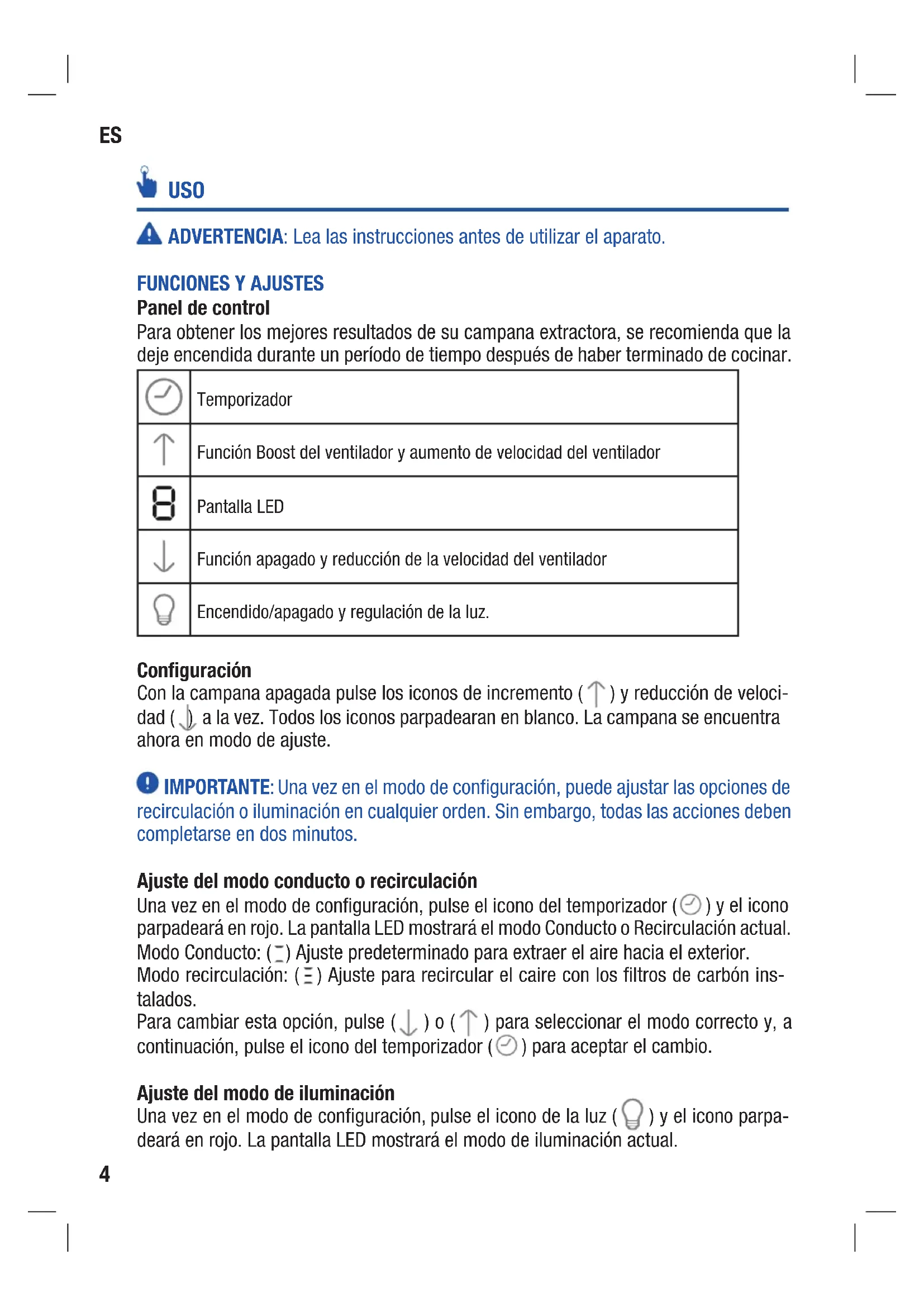 Panel de control Para obtener los mejores resultados de su campana extractora, se recomienda que la deje encendida durante un período de tiempo después de haber terminado de cocinar. Temporizador Función Boost del ventilador y aumento de velocidad del ventilador Pantalla LED Función apagado y reducción de la velocidad del ventilador Encendido/apagado y regulación de la luz. Configuración Con la campana apagada pulse los iconos de incremento ( ) y reducción de veloci- dad ( ) a la vez. Todos los iconos parpadearan en blanco. La campana se encuentra ahora en modo de ajuste. IMPORTANTE: Una vez en el modo de configuración, puede ajustar las opciones de recirculación o iluminación en cualquier orden. Sin embargo, todas las acciones deben completarse en dos minutos. Ajuste del modo conducto o recirculación Una vez en el modo de configuración, pulse el icono del temporizador ( ) y el icono parpadeará en rojo. La pantalla LED mostrará el modo Conducto o Recirculación actual. Modo Conducto: ( ) Ajuste predeterminado para extraer el aire hacia el exterior. Modo recirculación: ( ) Ajuste para recircular el caire con los filtros de carbón ins- talados. Para cambiar esta opción, pulse ( ) o ( ) para seleccionar el modo correcto y, a continuación, pulse el icono del temporizador ( ) para aceptar el cambio. Ajuste del modo de iluminación Una vez en el modo de configuración, pulse el icono de la luz ( ) y el icono parpa- deará en rojo. La pantalla LED mostrará el modo de iluminación actual.ES