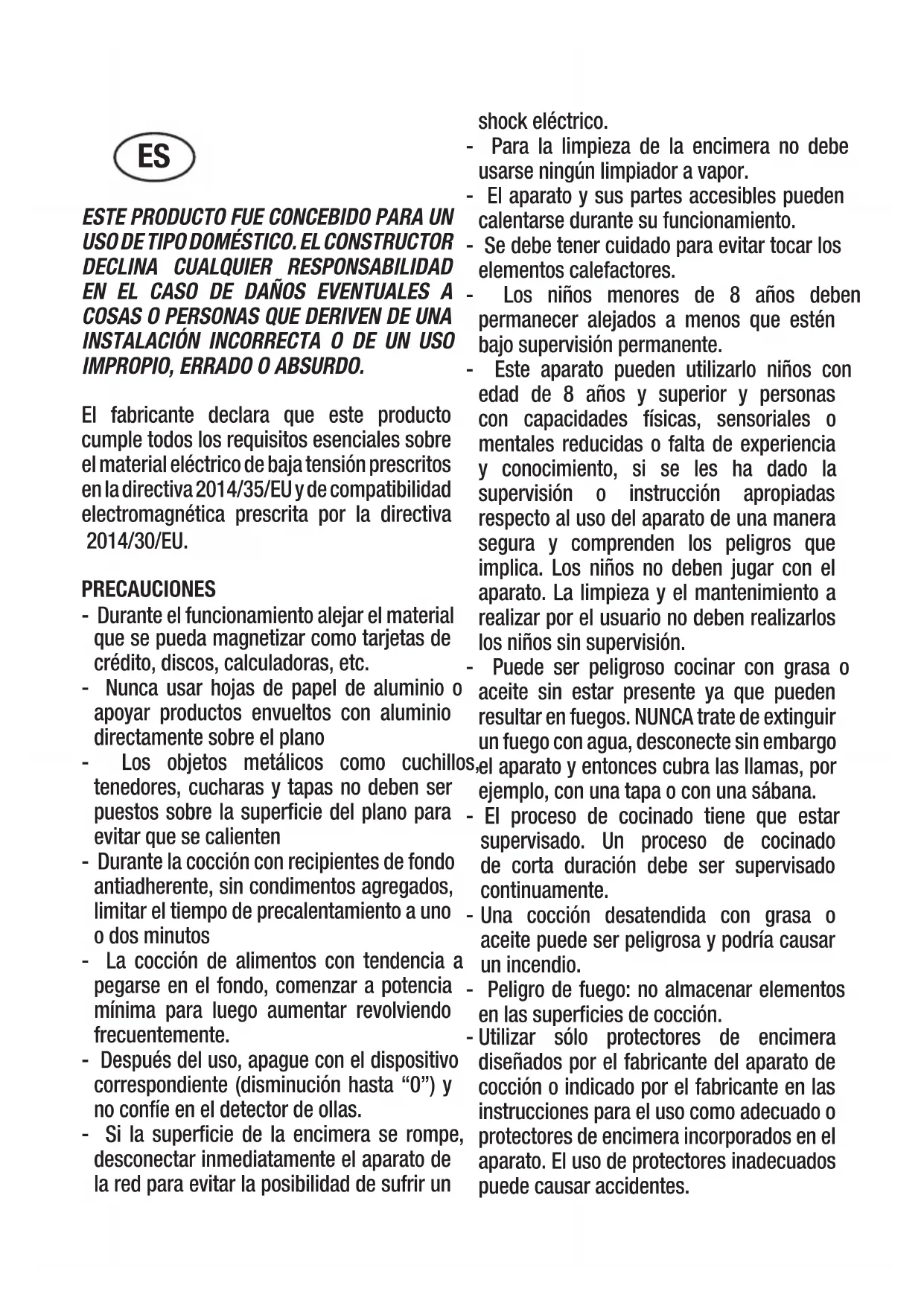 EN EL CASO DE DAÑOS EVENTUALES A COSAS O PERSONAS QUE DERIVEN DE UNA INSTALACIÓN INCORRECTA O DE UN USO IMPROPIO, ERRADO O ABSURDO. El fabricante declara que este producto cumple todos los requisitos esenciales sobre el material eléctrico de baja tensión prescritos en la directiva 2014/35/EU y de compatibilidad electromagnética prescrita por la directiva 2014/30/EU. PRECAUCIONES - Durante el funcionamiento alejar el material que se pueda magnetizar como tarjetas de crédito, discos, calculadoras, etc. - Nunca usar hojas de papel de aluminio o apoyar productos envueltos con aluminio directamente sobre el plano - Los objetos metálicos como cuchillos, tenedores, cucharas y tapas no deben ser puestos sobre la superficie del plano para evitar que se calienten - Durante la cocción con recipientes de fondo antiadherente, sin condimentos agregados, limitar el tiempo de precalentamiento a uno o dos minutos - La cocción de alimentos con tendencia a pegarse en el fondo, comenzar a potencia mínima para luego aumentar revolviendo frecuentemente. - Después del uso, apague con el dispositivo correspondiente (disminución hasta “0”) y no confíe en el detector de ollas. - Si la superficie de la encimera se rompe, desconectar inmediatamente el aparato de la red para evitar la posibilidad de sufrir un shock eléctrico. - Para la limpieza de la encimera no debe usarse ningún limpiador a vapor. - El aparato y sus partes accesibles pueden calentarse durante su funcionamiento. - Se debe tener cuidado para evitar tocar los elementos calefactores. - Los niños menores de 8 años deben permanecer alejados a menos que estén bajo supervisión permanente. - Este aparato pueden utilizarlo niños con edad de 8 años y superior y personas con capacidades físicas, sensoriales o mentales reducidas o falta de experiencia y conocimiento, si se les ha dado la supervisión o instrucción apropiadas respecto al uso del aparato de una manera segura y comprenden los peligros que implica. Los niños no deben jugar con el aparato. La limpieza y el mantenimiento a realizar por el usuario no deben realizarlos los niños sin supervisión. - Puede ser peligroso cocinar con grasa o aceite sin estar presente ya que pueden resultar en fuegos. NUNCA trate de extinguir un fuego con agua, desconecte sin embargo el aparato y entonces cubra las llamas, por ejemplo, con una tapa o con una sábana. - El proceso de cocinado tiene que estar supervisado. Un proceso de cocinado de corta duración debe ser supervisado continuamente. - Una cocción desatendida con grasa o aceite puede ser peligrosa y podría causar un incendio. - Peligro de fuego: no almacenar elementos en las superficies de cocción. - Utilizar sólo protectores de encimera diseñados por el fabricante del aparato de cocción o indicado por el fabricante en las instrucciones para el uso como adecuado o protectores de encimera incorporados en el aparato. El uso de protectores inadecuados puede causar accidentes. ESInstale en el cableado fijo un medio de desconexión de la red eléctrica con una separación de contacto en todos los polos que permita una desconexión completa en condiciones de sobretensión de categoría III, de acuerdo con la normativa de cableado. El enchufe o el interruptor omnipolar tienen que ser fácilmente alcanzables con el aparato instalado. Este aparato no está previsto para hacerlo funcionar por medio de un temporizador externo o sistema de control remoto separado. El constructor declina cualquier responsa