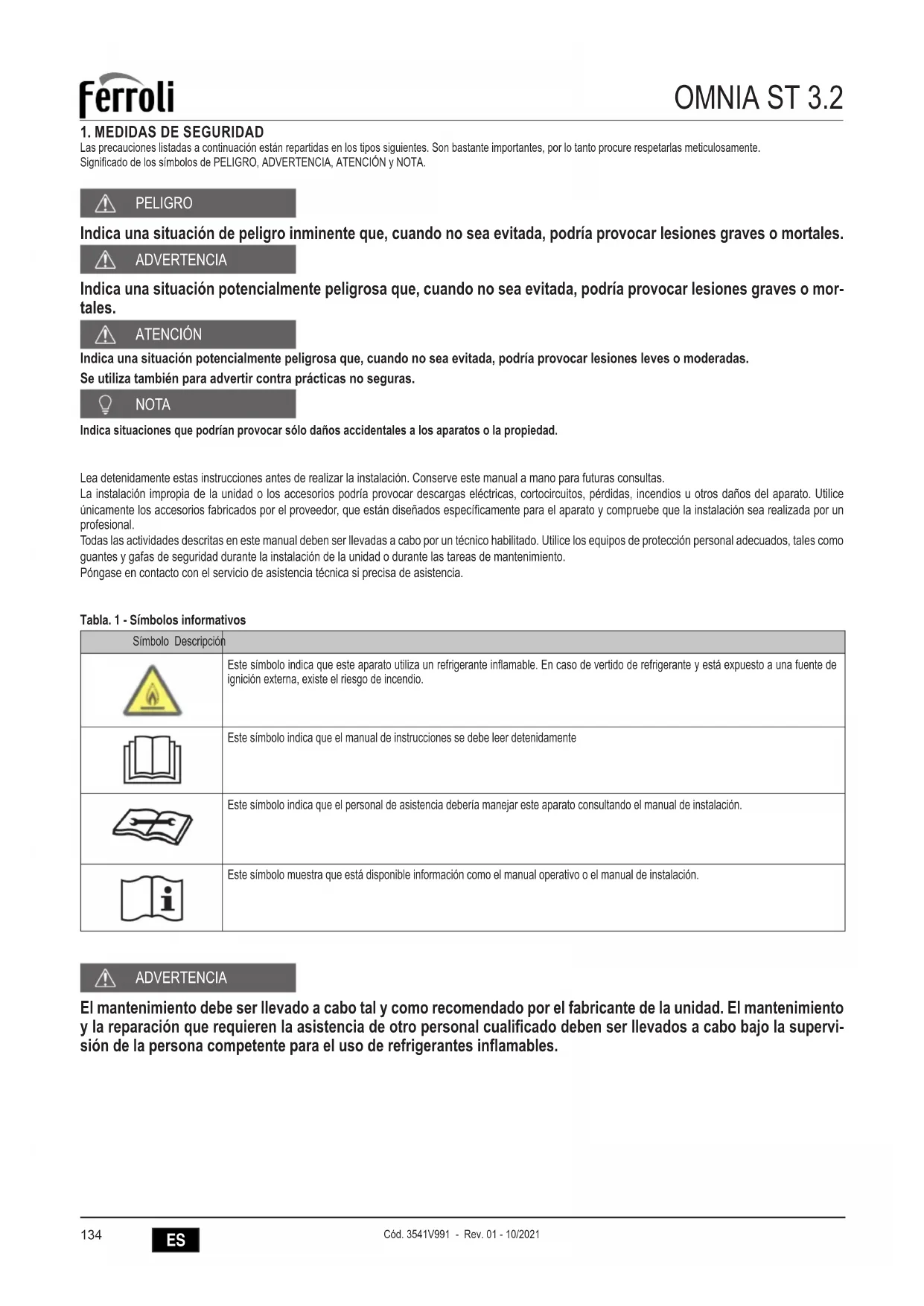 Cód. 3541V991 - Rev. 01 - 10/2021 OMNIA ST 3.2 El calentador de aceite del compresor puede funcionar aunque el compresor esté parado. Procure no tocar los cables eléctricos en tensión. No lave la unidad. Esto puede provocar una descarga eléctrica o un incendio. Cuando los paneles de servicio están extraídos es muy fácil tocar inadvertidamente las partes en tensión. No deje nunca la unidad sin vigilancia durante la instalación o el mantenimiento si el panel de servicio se ha extraído. No está permitido alterar ni modificar ningún componente, ni los ajustes de los valores de actuación de los dispositivos de protección instalados en la unidad. No tire de los cables que salen de la unidad, no los arranque ni los retuerza, aunque la unidad esté desconectada de la red eléctrica. Está prohibido dejar recipientes con sustancias inflamables cerca de la unidad. No toque el equipo si está descalzo o tiene alguna parte del cuerpo húmeda o mojada. Los controles descritos deben ser realizados al menos una vez al año por personal cualificado. Cuadro eléctrico Realice un atento control visual de los componentes del cuadro eléctrico para comprobar si hay componentes o cables dañados o conectados de manera incorrecta (controle el apriete de los tornillos de los bornes). Riesgos residuales Las unidades están diseñadas con el criterio de minimizar los riesgos para las personas y para el ambiente de instalación. Por lo tanto, para eliminar los riesgos residuales se recomienda familiarizarse en la mayor medida posible con el equipo, a fin de evitar accidentes con daños materiales o personales. a. Acceso a la unidad El acceso a la unidad debe estar permitido sólo a personal cualificado que tenga familiaridad con este tipo de equipo, y esté dotado de los equipos de protección individual necesarios (zapatos de seguridad, guantes, casco, etc.). Asimismo, el personal debe estar autorizado por el propietario del equipo y por el fabricante. b. Factores de riesgo El equipo está diseñado y construido de modo tal que no genere ninguna situación de riesgo. No obstante, existen riesgos residuales que no se pueden eliminar en el diseño. En la tabla siguiente se detallan dichos riesgos junto a las medidas necesarias para neutralizarlos. Riesgos residuales unidad interior Pieza involucrada Riesgos residuales Modo Precauciones Tuberías frigoríficas e hidráulicas Quemaduras Contacto con los tubos Utilice guantes de protección para evitar el contacto Tuberías de refrigerante, intercambia-dor de calor de placas.Explosión Presión excesivaApague el equipo y controle el presostato de alta presión, la válvula de seguridad, los ventiladores y el condensador.Tuberías de refrigerante Quemaduras por hielo Fuga de refrigerante No fuerce los tubosCables eléctricos, partes metálicas Descarga eléctrica, quemaduras graves Aislamiento defectuoso del cable, partes metálicas en tensión Instale una protección eléctrica adecuada (controle la puesta a tierra) Riesgos residuales unidad exterior Pieza involucrada Riesgos residuales Modo Precauciones Compresor y tubería de impulsión Quemaduras Contacto con las tuberías o con el compresor Utilice guantes de protección para evitar el contacto Tuberías de descarga y serpentínExplosión Presión excesivaApague el equipo y controle el presostato de alta presión, la válvula de seguridad, los ventiladores y el condensador. Tuberías de refrigerante Quemaduras por hielo Fuga de refrigerante No fuerce los tubos Cables eléctricos, partes metálicasDescarga eléctrica, quemaduras gravesAislamiento defectuoso del cable, partes metálicas en tensiónInstale una protección eléctrica adecuada (controle la puesta a tierra) Bobinas de intercambio térmico Cortes Contacto Utilice guantes de protección Ventiladores Cortes Contacto con la piel No introduzca las manos ni objetos a través de la rejilla de protección del ventilador Normas generales de mantenimiento El mantenimiento es fundamental para asegurar el funcionamiento de la instalación y el funcionamiento normal de la unidad en el tiempo. En conformidad con el Reglamento Europeo CE 303/2008, se recuerda que las empresas y los ingenieros encargados de las operaciones de mantenimiento, repara- ción, control de fugas y recogida/reciclaje de los gases refrigerantes deben estar AUTORIZADOS de acuerdo con las normas locales. El mantenimiento debe ser realizado de acuerdo con las normas de seguridad y las indicaciones incluidas en el manual suministrado con la unidad. El mantenimiento ordinario permite asegurar las prestaciones de la unidad, prolongar su vida útil y recoger información y datos que permitan evaluar la eficiencia de la unidad y prevenir los fallos. El mantenimiento extraordinario y las reparaciones del equipo deben efectuarse solo en centros de asistencia especializados y autorizados por el fabricante, con el uso de recambios originales. De acuerdo con el Reglamento Europeo CE 1516/2007 es necesario dotarse de un “registro de aparatos”. Dotarse de un registro de datos (no suministrado) donde se registren todas las operaciones realizadas en la unidad. De este modo será más fácil programar las intervenciones y facilitar la solución de los problemas hallados. Apunte en el registro de datos: fecha, tipo de intervención realizada, descripción de la intervención, medidas tomadas, anomalías encontradas, alarmas registradas en el historial de alarmas, etc.