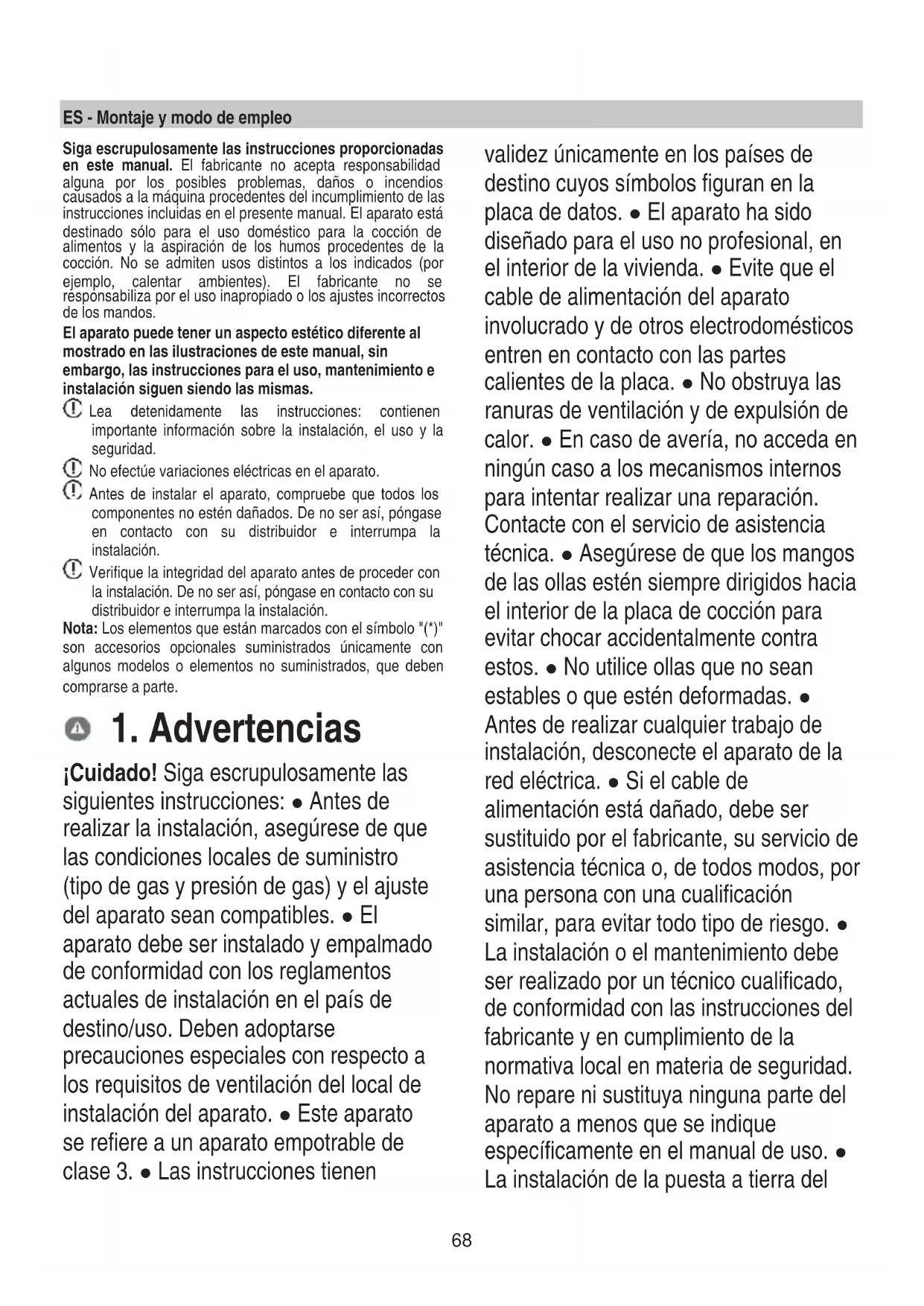 ¡Cuidado! Siga escrupulosamente las siguientes instrucciones: ● Antes de realizar la instalación, asegúrese de que las condiciones locales de suministro (tipo de gas y presión de gas) y el ajuste del aparato sean compatibles. ● El aparato debe ser instalado y empalmado de conformidad con los reglamentos actuales de instalación en el país de destino/uso. Deben adoptarse precauciones especiales con respecto a los requisitos de ventilación del local de instalación del aparato. ● Este aparato se refiere a un aparato empotrable de clase 3. ● Las instrucciones tienen validez únicamente en los países de destino cuyos símbolos figuran en la placa de datos. ● El aparato ha sido diseñado para el uso no profesional, en el interior de la vivienda. ● Evite que el cable de alimentación del aparato involucrado y de otros electrodomésticos entren en contacto con las partes calientes de la placa. ● No obstruya las ranuras de ventilación y de expulsión de calor. ● En caso de avería, no acceda en ningún caso a los mecanismos internos para intentar realizar una reparación. Contacte con el servicio de asistencia técnica. ● Asegúrese de que los mangos de las ollas estén siempre dirigidos hacia el interior de la placa de cocción para evitar chocar accidentalmente contra estos. ● No utilice ollas que no sean estables o que estén deformadas. ● Antes de realizar cualquier trabajo de instalación, desconecte el aparato de la red eléctrica. ● Si el cable de alimentación está dañado, debe ser sustituido por el fabricante, su servicio de asistencia técnica o, de todos modos, por una persona con una cualificación similar, para evitar todo tipo de riesgo. ● La instalación o el mantenimiento debe ser realizado por un técnico cualificado, de conformidad con las instrucciones del fabricante y en cumplimiento de la normativa local en materia de seguridad. No repare ni sustituya ninguna parte del aparato a menos que se indique específicamente en el manual de uso. ● La instalación de la puesta a tierra del69 aparato es obligatoria. ● Para que la instalación cumpla con las normas de seguridad vigentes, es necesario un interruptor de corte omnipolar bajo norma que asegure la desconexión completa de la red eléctrica en condiciones de la categoría de sobrecarga III, de acuerdo con las reglas de instalación. ● No utilice tomas eléctricas múltiples ni alargadores eléctricos. ● Una vez finalizada la instalación, los componentes eléctricos no deberán ser accesibles al usuario. ● El equipo y sus partes accesibles se calientan durante el uso. Tener cuidado de no tocar los elementos de calentamiento. ● Asegúrese de que los niños no jueguen con el aparato; procure vigilar a los niños y manténgalos a una distancia prudente, ya que las partes accesibles pueden calentarse mucho durante el uso. ● Durante y después del uso, no toque los elementos de calentamiento del dispositivo. ● Evite el contacto con paños u otros materiales inflamables hasta que todos los componentes del aparato se hayan enfriado lo suficiente. ● No coloque materiales inflamables sobre el dispositivo o en sus proximidades. ● Las grasas y aceites ya utilizados son fácilmente inflamables. Preste atención especial a la cocción de alimentos con mucha grasa y aceite. ● Si la superficie se encuentra agrietada, apague el aparato para evitar la posibilidad de una descarga eléctrica. ● El aparato no está destinado a ser puesto en funcionamiento por medio de un temporizador externo o un sistema separado de control remoto. ● El proceso de cocción debe ser supervisado. ● NUNCA intente apagar el fuego con agua. En su lugar, apague el aparato y use por ejemplo una tapa o una manta ignífuga para sofocar las llamas. Peligro de incendio: no coloque objetos sobre las superficies de cocción. ● No utilice limpiadoras a vapor. ● Antes de conectar el producto a la red eléctrica: verifique la placa de datos (montada en la parte inferior del aparato) para cerciorarse de que el voltaje y la potencia se correspondan con aquellos de la red eléctrica y que el enchufe sea adecuado. En caso de duda, póngase en contacto con un electricista cualificado. Importante: ● Después de su uso, apague la placa de cocción a través de su dispositivo de control. ● Para evitar derrames de líquido, reduzca la alimentación de calor. ● No deje los elementos de calentamiento encendidos con ollas o sartenes vacías o sin recipientes. ● Cuando se termine de cocinar, apague la zona correspondiente. ● No deje ollas vacías sobre los elementos de calentamiento encendidos. ● No utilice recipientes que sobresalen de los bordes de la placa. ● ¡CUIDADO! En caso de rotura de la placa de vidrio:
