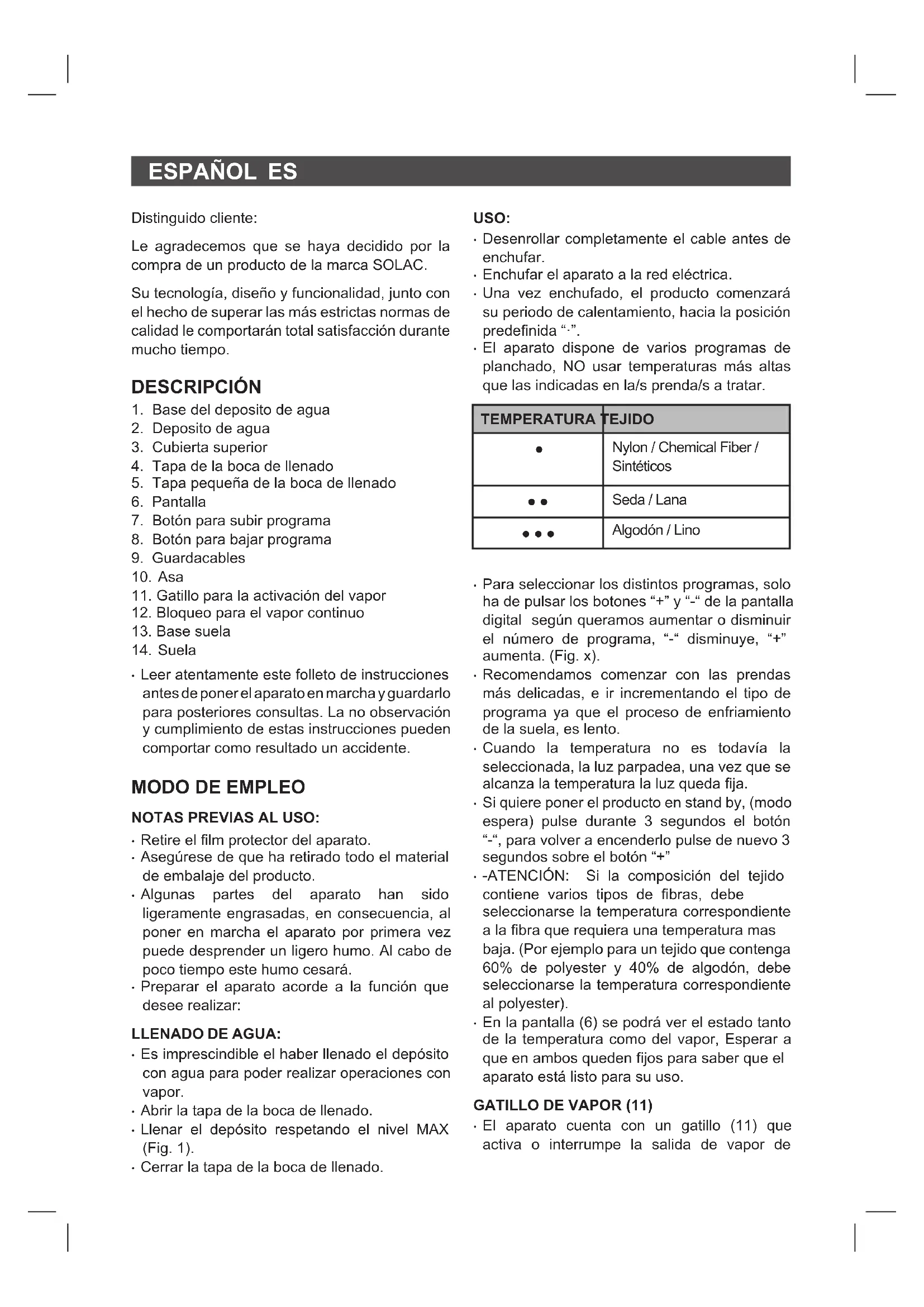 Cotton / LinenES) GARANTÍA Y ASISTENCIA TÉCNICA Este producto goza del reconocimiento y protección de la garantía legal de conformidad con la legislación vigente. Para hacer valer sus derechos o intereses debe acudir a cualquiera de nuestros servicios de asistencia técnica ociales. Podrá encontrar el más cercano accediendo al siguiente enlace web: http://solac.com También puede solicitar información relacionada poniéndose en contacto con nosotros por el teléfono que aparece al nal de este manual. Puede descargar este manual de instrucciones y sus actualizaciones en http://solac.com