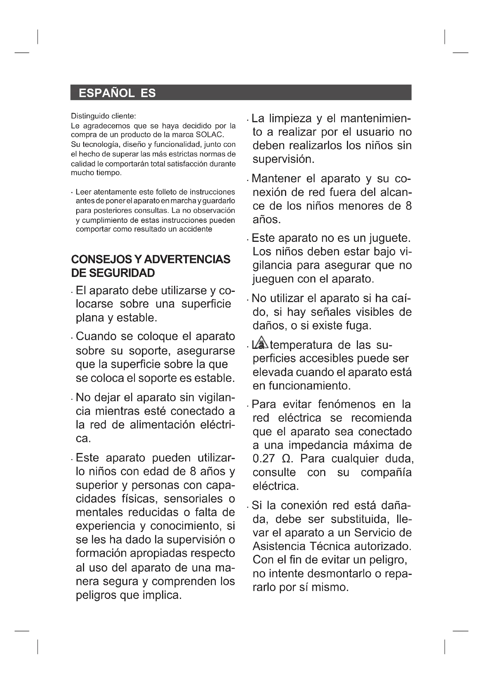 Distinguido cliente: Le agradecemos que se haya decidido por la compra de un producto de la marca SOLAC. Su tecnología, diseño y funcionalidad, junto con el hecho de superar las más estrictas normas de calidad le comportarán total satisfacción durante mucho tiempo.