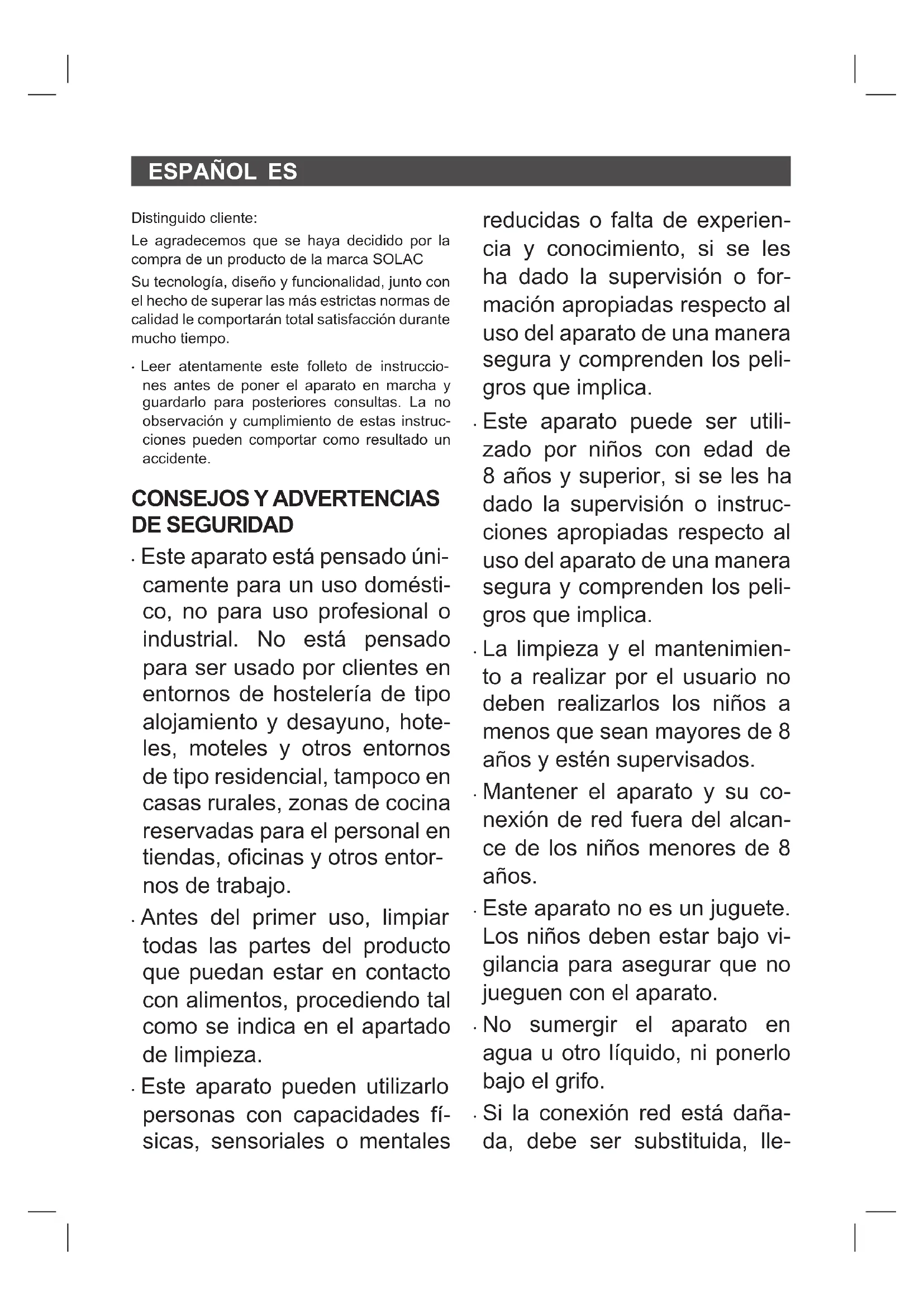 - El producto está exento de concentraciones de sustancias que se puedan considerar da- ñinas para el medio ambiente. Este símbolo signica que si desea des- hacerse del producto, una vez transcu- rrida la vida del mismo, debe depositar- lo por los medios adecuados a manos de un gestor de residuos autorizado para la recogida selectiva de Residuos de Aparatos Eléctricos y Electrónicos (RAEE). Este aparato cumple con la Directiva 2014/35/ EU de Baja Tensión, con la Directiva 2014/30/ EU de Compatibilidad Electromagnética, con la Directiva 2011/65/EU sobre restricciones a la utilización de determinadas sustancias peligro- sas en aparatos eléctricos y electrónicos y con la Directiva 2009/125/EC sobre los requisitos de diseño ecológico aplicable a los productosENGLISH EN Dear customer, Many thanks for choosing to purchase a SOLAC brand product. Thanks to its technology, design and operation and the fact that it exceeds the strictest quality standards, a fully satisfactory use and long prod- uct life can be assured.