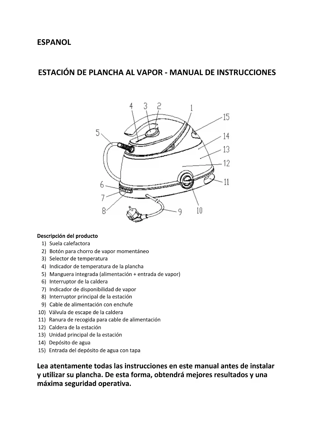 Lea atentamente todas las instrucciones en este manual antes de instalar y utilizar su plancha. De esta forma, obtendrá mejores resultados y una máxima seguridad operativa.INSTRUCCIONES DE SEGURIDAD Lea cuidadosamente las siguientes instrucciones: - Antes de enchufar la plancha al tomacorriente, verifique que la tensión de su red eléctrica se corresponda con la que se muestra en la placa de características de la estación. Conecte su plancha solamente en tomacorrientes conectados a tierra (mínimo 10 A). - En caso de incompatibilidad entre el enchufe y el tomacorriente, haga que el tomacorriente sea reemplazado por un electricista cualificado. - La seguridad eléctrica de este electrodoméstico solo es garantizada si el mismo está correctamente conectado a tierra de acuerdo con las normas de seguridad eléctrica vigentes. El fabricante declina toda responsabilidad por cualquier daño que resulte de una conexión a tierra inadecuada. En caso de dudas, consulte a un electricista cualificado. - No deje agua en el depósito de la estación cuando la temperatura ambiente sea de 0℃ o menor. - Después de desembalar, verifique que el electrodoméstico no esté dañado, en caso de duda, no use la estación y contacte a un técnico cualificado. - Los materiales de embalaje (bolsas de plástico, cajas, nylon, poliestireno, etc.) son una fuente potencial de peligro y se deben mantener fuera del alcance de los niños. - No es aconsejable usar adaptadores, enchufes múltiples y/o extensiones. En los casos en que esto sea inevitable, siempre use adaptadores, enchufes múltiples y extensiones que cumplan con las normas de seguridad vigentes. No exceda la potencia máxima que se muestra en el adaptador. - Este electrodoméstico está diseñado solo para uso doméstico. Cualquier otro uso se considera inapropiado y por lo tanto, peligroso.- El fabricante declina toda responsabilidad por cualquier daño que resulte del uso incorrecto, descuidado o imprudente de la estación. - Esta estación de planchado no está prevista para ser utilizada por personas (incluyendo niños) con discapacidad física, sensorial o motora, o con falta de experiencia y conocimiento, a menos que sean supervisadas o hayan sido debidamente instruidas para el uso seguro de la estación por parte de una persona responsable por su seguridad. - Cuando se trata de electrodomésticos, siempre debe acatar las precauciones básicas de seguridad. - Si el cable de alimentación está dañado, deberá ser reemplazado por el fabricante, su agente de servicios técnicos o una persona cualificada, a fin de evitar una situación peligrosa. - Verifique que no haya niños cerca de la plancha cuando vaya a presionar el botón para chorro de vapor momentáneo, el chorro tiene un largo alcance. En particular: - No toque la plancha si sus manos o pies están mojados o húmedos. - No use la plancha en el baño. - No tire del cable de alimentación para desconectar el enchufe del tomacorriente. - No deje su plancha expuesta a agentes atmosféricos (lluvia, sol, sereno, etc.). - No permita que la plancha sea utilizada por niños o personas irresponsables a menos que estén bajo supervisión adulta. - No sumerja la plancha en el agua. - No deje la plancha desatendida cuando la misma esté encendida, esto puede ser muy peligroso. - Antes de realizar cualquier operación de limpieza o mantenimiento, o cuando vaya a agregar agua en eldepósito de la estación, siempre desenchufe el cable de alimentación del tomacorriente. - En caso de fallas o mal funcionamiento, apague la plancha y no intente realizar reparaciones. Póngase en contacto con un centro de servicios autorizado e insista en piezas de repuesto originales. El incumplimiento de los puntos anteriores puede afectar el funcionamiento del electrodoméstico. - Si decide no volver a utilizar el electrodoméstico, desenchúfelo y retire el cable de alimentación de la estación para inutilizarla por completo. - La estación debe ser instalada siguiendo las instrucciones del fabricante. - El cable de alimentación no debe ser reemplazado por el usuario, ya que esto requiere el uso de herramientas especiales; si el cable de alimentación está dañado, comuníquese con un centro de servicios autorizado. - No permita que el cable de alimentación entre en contacto con la suela calefactora de la plancha. - Si se activa la desconexión automática de seguridad, la estación queda inoperable. Para restablecer el funcionamiento normal contacte a un electricista cualificado. - Nunca dirija el chorro de vapor en dirección a las personas, ya que esto puede ser extremadamente peligroso. - No use la plancha en telas demasiado húmedas. - No permita que la plancha entre en contacto con su cuerpo, ni la coloque por la suela calefactora cuando esté caliente. - No llene demasiado el depósito de agua y no agregue quitamanchas o productos similares en el depósito ni en la caldera. - Retire el enchufe del tomacorriente cuando no esté usando la estación. No deje la estación encendidainnecesariamente. - Nunca afloje o desenrosque la válvula de escape de la caldera cuando la estación esté conectada al tomacorriente. - La estación de planchado se debe colocar sobre una superficie plana y que sea particularmente resistente al calor. - Directiva CEE 87/308 (D.M. 13/04/89). Guarde este documento en un lugar seguro para posibles referencias en el futuro. Este electrodoméstico cumple con la Directiva CEE 87/308 (D.M. 13/04/89) con respecto a la supresión de las perturbaciones radioeléctricas.