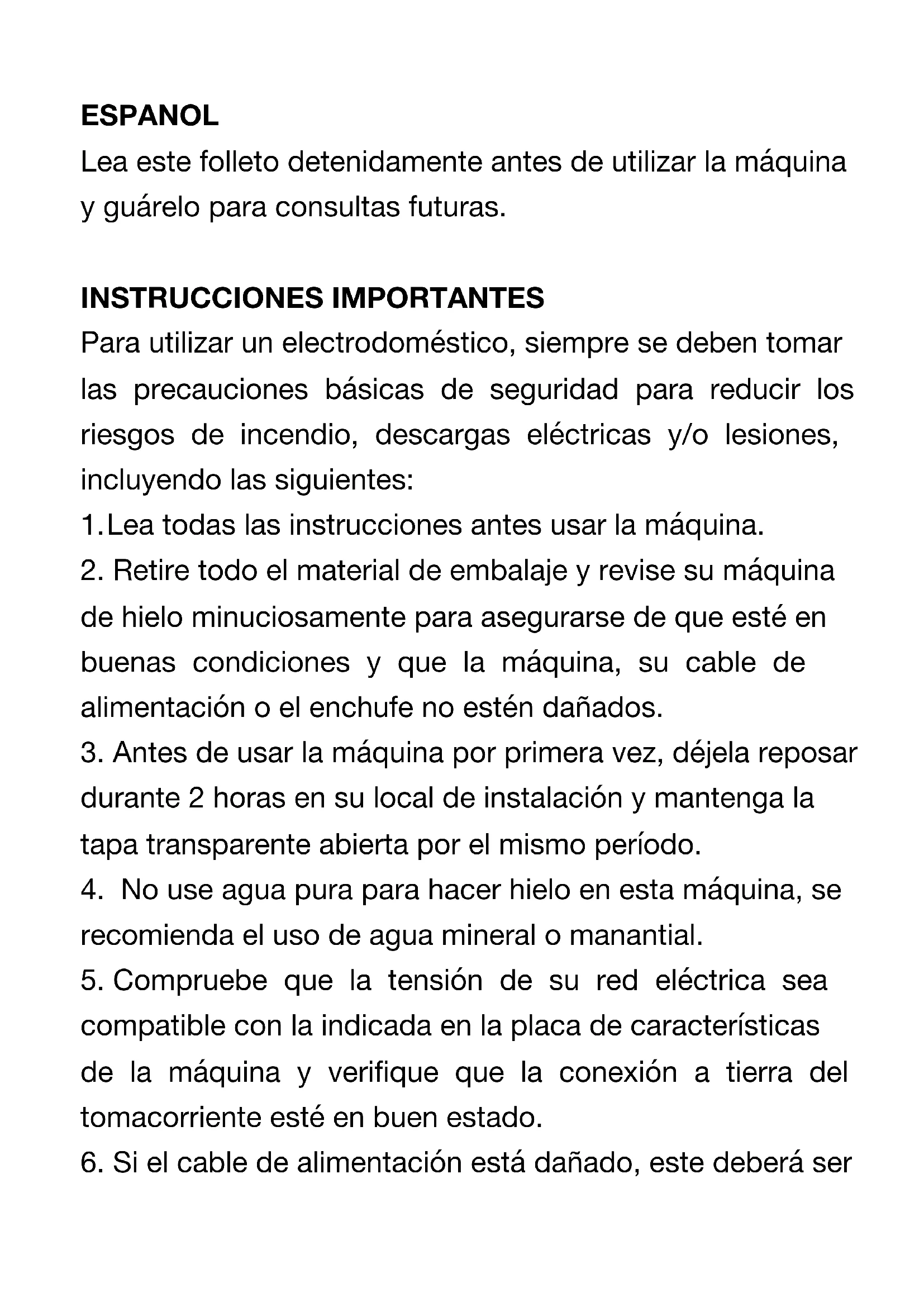- Retire todo el material de embalaje y revise suquina de hielo minuciosamente para asegurar de que esté en buena conditiones y que laquina, su cable de alimentación o el enchufe no está dañados.