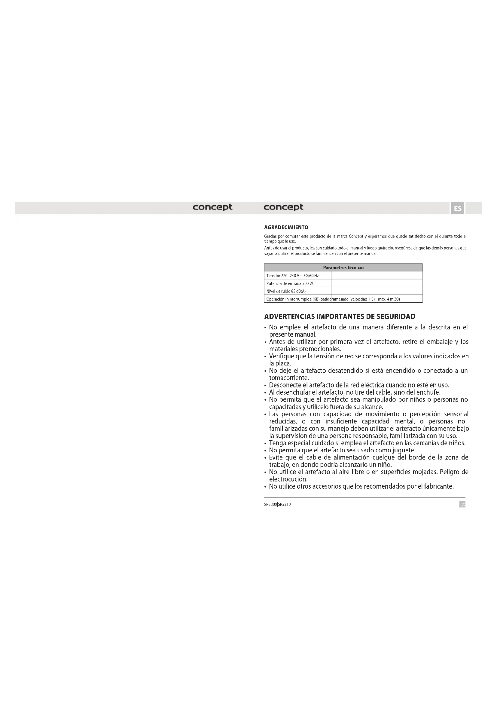 SR3300|SR3310 AGRADECIMIENTO Gracias por comprar este producto de la marca Concept y esperamos que quede satisfecho con él durante todo el tiempo que lo use. Antes de usar el producto, lea con cuidado todo el manual y luego guárdelo. Asegúrese de que las demás personas que vayan a utilizar el producto se familiaricen con el presente manual. Parámetros técnicos Tensión 220–240 V ~ 50/60 Hz Potencia de entrada 500 W Nivel de ruido 85 dB(A) Operación ininterrumpida (KB) batido/amasado (velocidad 1-5) - max. 4 m 30s