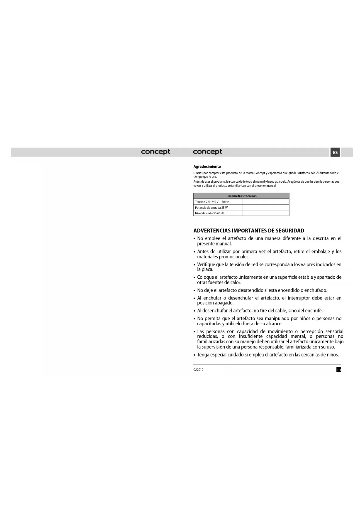 CA2010 Agradecimiento Gracias por comprar este producto de la marca Concept y esperamos que quede satisfecho con él durante todo el tiempo que lo use. Antes de usar el producto, lea con cuidado todo el manual y luego guárdelo. Asegúrese de que las demás personas que vayan a utilizar el producto se familiaricen con el presente manual. Parámetros técnicos Tensión 220-240 V ~ 50 Hz Potencia de entrada 85 W Nivel de ruido 30-60 dB