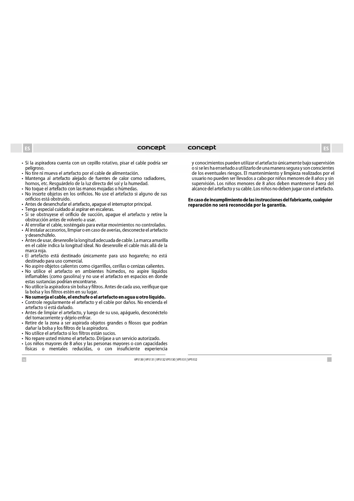 - Los niños mayores de 8 años y las personas mayores o con capacidades físicas o mentales reducidas, o con insuficiente experiencia yconocimientos pueden utilizar el artefacto únicamente bajo supervisión o si se les ha enseñado a utilizarlo de una manera segura y son conscientes de los eventuales riesgos. El mantenimiento y limpieza realizados por el usuario no pueden ser llevados a cabo por niños menores de 8 años y sin supervisión. Los niños menores de 8 años deben mantenerse fuera del alcance del artefacto y su cable. Los niños no deben jugar con el artefacto. En caso de incumplimiento de las instrucciones del fabricante, cualquier reparación no será reconocida por la garantía.78 79 ESES VP5130 | VP5131 | VP5132 VP5130 | VP5131 | VP5132