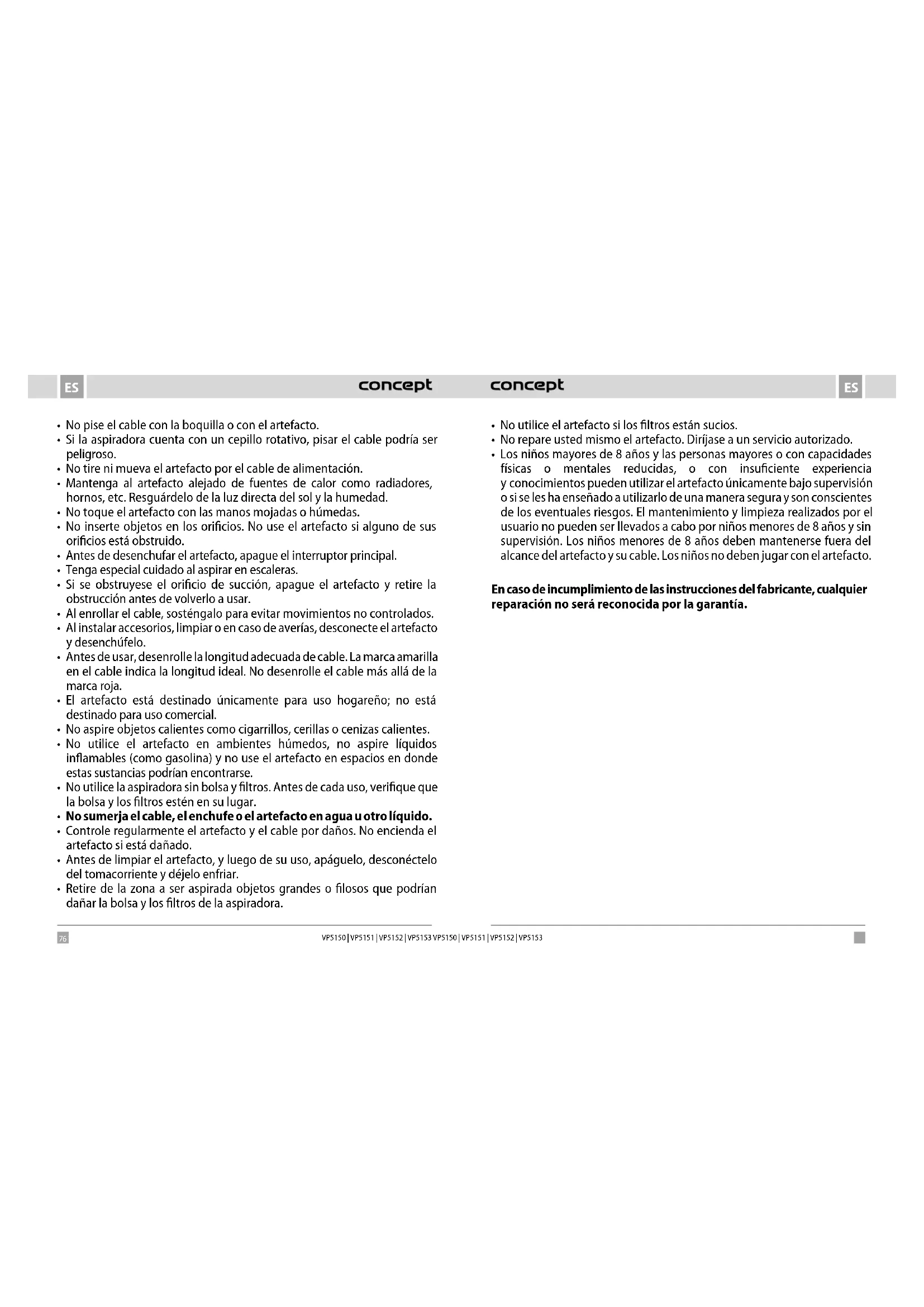 VP5150 | VP5151 | VP5152 | VP5153 AGRADECIMIENTO Gracias por comprar este producto de la marca Concept y esperamos que quede satisfecho con él durante todo el tiempo que lo use. Antes de usar el producto, lea con cuidado todo el manual y luego guárdelo. Asegúrese de que las demás personas que vayan a utilizar el producto se familiaricen con el presente manual. Parámetros técnicos Tensión 220–240 V ~ 50-60 Hz Potencia de entrada 800 W Nivel de ruido ≤78 dB