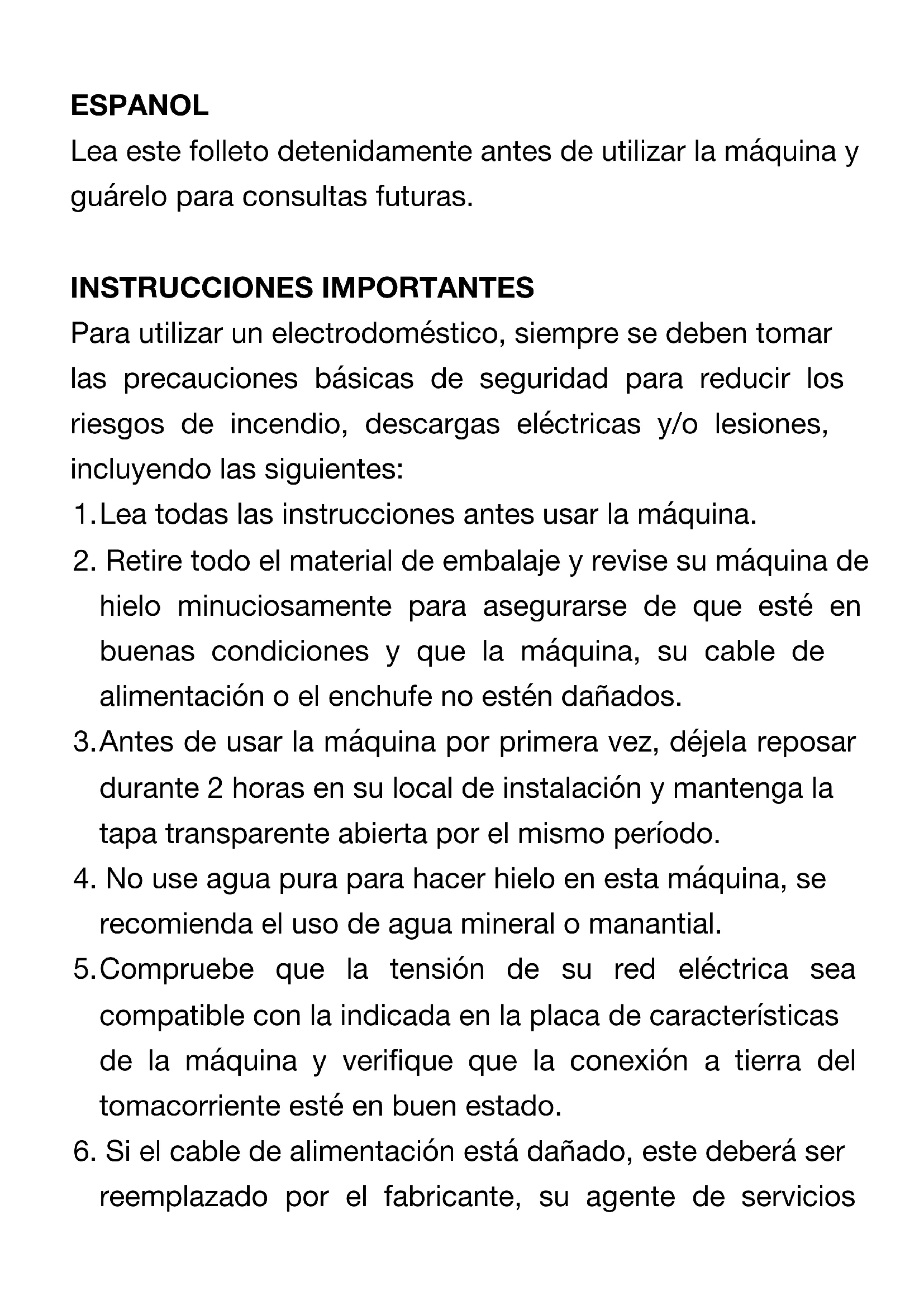 - Retire todo el material de embalaje y revise suquina de hielo minuciosamente para asegurar de que esté en buena conditiones y que laquina, su cable de alimentacion o el enchufe no está danados.