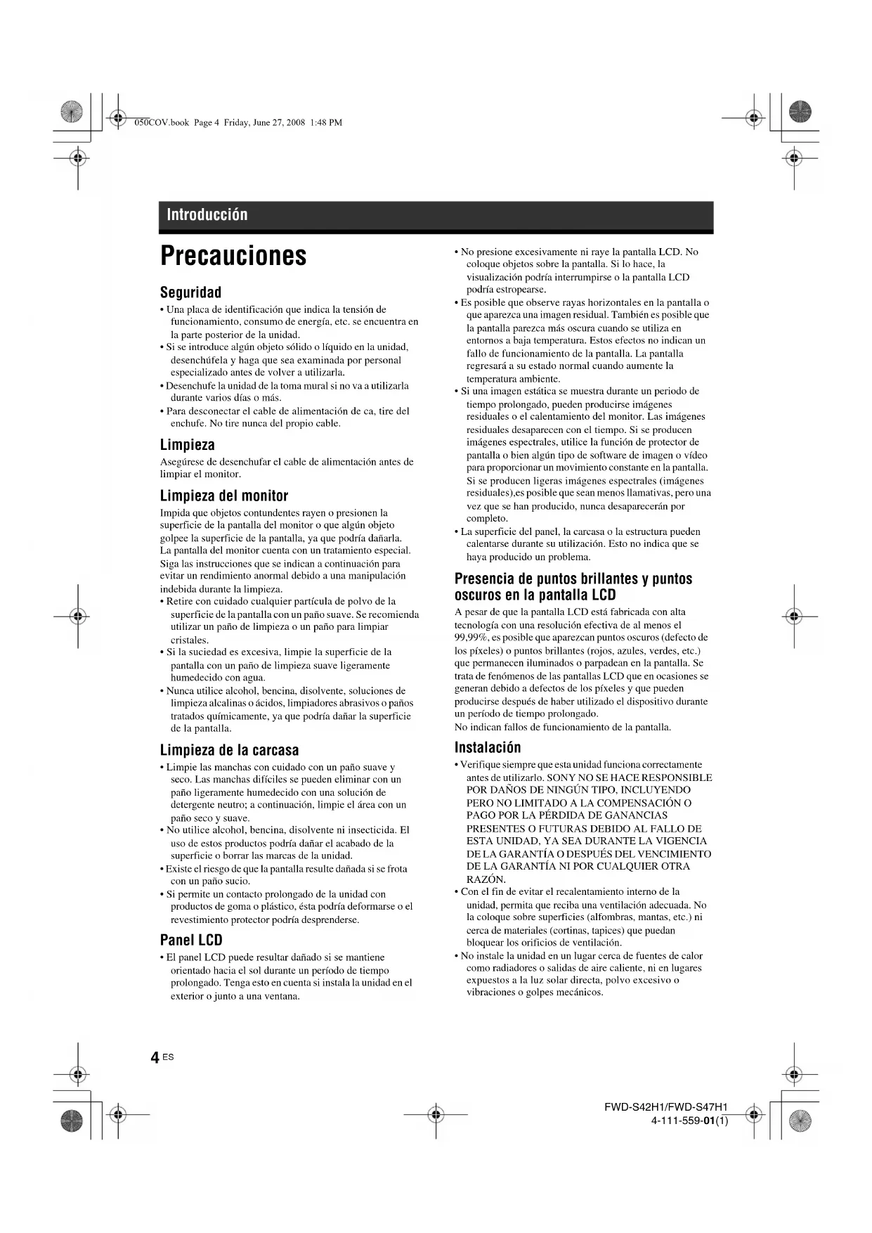 - Cuando instale varios equipos con la unidad, es posible que se produzcan los siguientes problemas como, por ejemplo, un fallo de funcionamiento del mando a distancia, imagen con ruido o sonido con ruido, en función de la posición de la unidad y del otro equipo. Embalaje No se deshaga de la caja ni de los materiales de embalaje. Son un contenedor ideal para transportar la unidad. Al trasladar la unidad, embálela tal como se indica en la caja. Si desea realizar alguna consulta referente a la unidad, póngase en contacto con un proveedor Sony autorizado. Tratamiento de equipos eléctricos y electrónicos de uso comercial al final de su vida útil (aplicable en la Unión Europea y en países europeos con sistemas de recogida selectiva de residuos) Este símbolo en su equipo o su embalaje indica que el presente producto no puede ser tratado como residuos domésticos normales. En su lugar, deben entregarse conforme al correspondiente plan de recogida para el reciclaje de equipos eléctricos y electrónicos. Asegurándose de que este producto es desechado correctamente, Ud. ayuda a prevenir las consecuencias negativas para el medio ambiente y la salud humana que podrían derivarse de la incorrecta manipulación de este producto. El reciclaje de materiales ayuda a conservar las reservas naturales. Para obtener información detallada sobre el reciclaje de este producto, contacte con su oficina local de Sony o visite la página Web europea de Sony para empresas: http://www.sonybiz.net/environment 050COV.book Page 5 Friday, June 27, 2008 1:48 PMFWD-S42H1/FWD-S47H14-111-559-01(1)