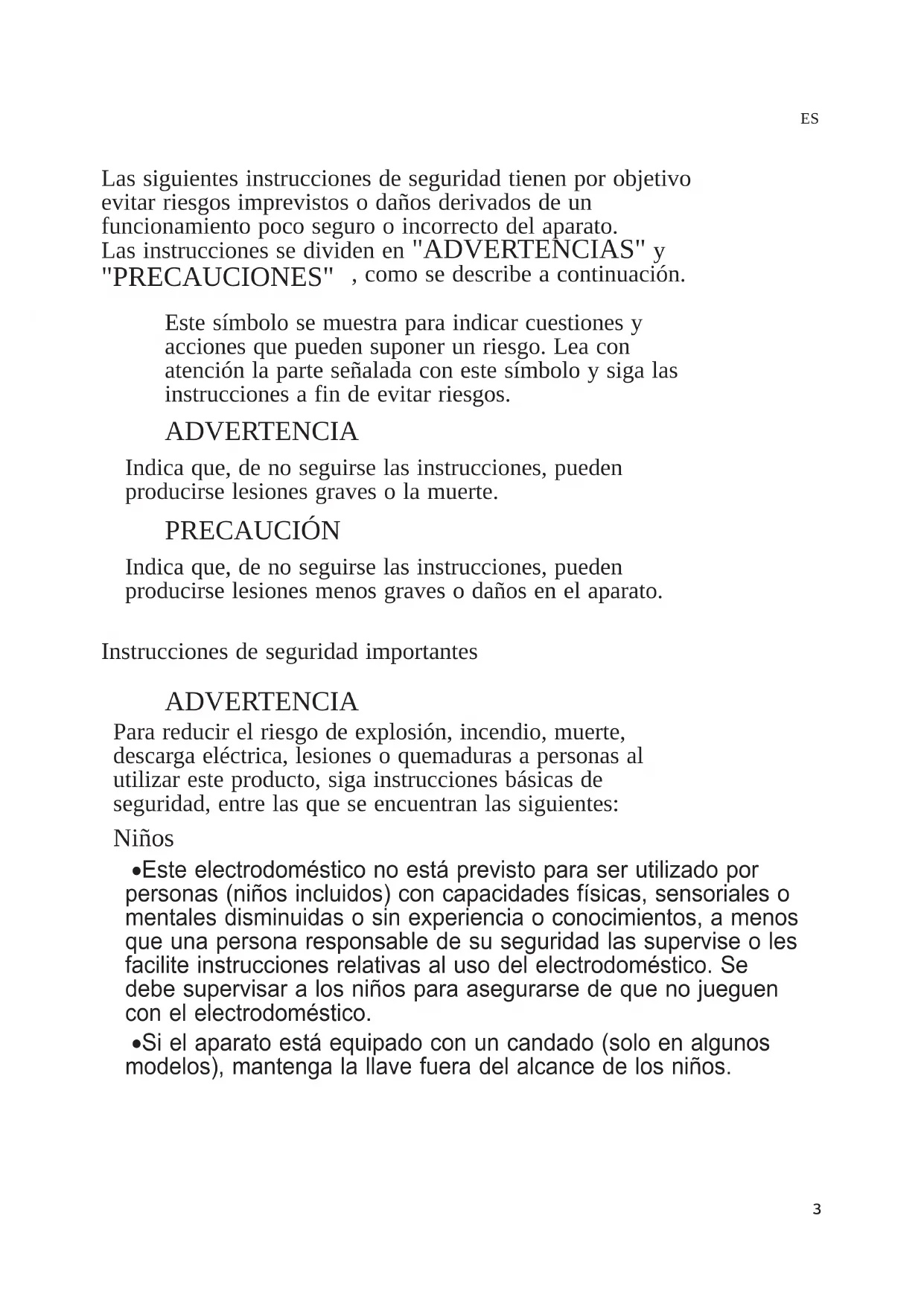 Las siguientes instrucciones de seguridad tienen por objetivo evitar riesgos imprevistos o daños derivados de un funcionamiento poco seguro o incorrecto del aparato. Las instrucciones se dividen en "ADVERTENCIAS" y "PRECAUCIONES" , como se describe a continuación. Este símbolo se muestra para indicar cuestiones y acciones que pueden suponer un riesgo. Lea con atención la parte señalada con este símbolo y siga las instrucciones a fin de evitar riesgos. ADVERTENCIA Indica que, de no seguirse las instrucciones, pueden producirse lesiones graves o la muerte. PRECAUCIÓN Indica que, de no seguirse las instrucciones, pueden producirse lesiones menos graves o daños en el aparato. Instrucciones de seguridad importantes ADVERTENCIA Para reducir el riesgo de explosión, incendio, muerte, descarga eléctrica, lesiones o quemaduras a personas al utilizar este producto, siga instrucciones básicas de seguridad, entre las que se encuentran las siguientes: Niños