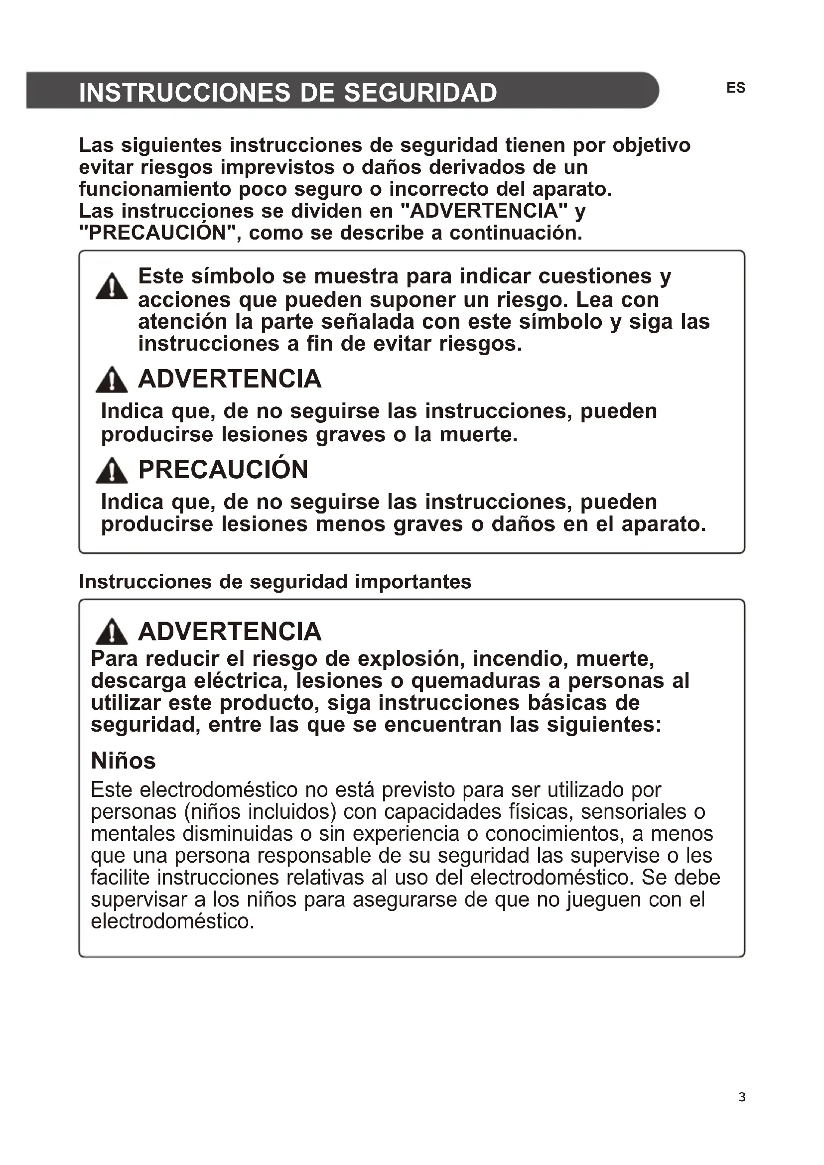Las siguientes instrucciones de seguridad tienen por objetivo evitar riesgos imprevistos o daños derivados de un funcionamiento poco seguro o incorrecto del aparato.Las instrucciones se dividen en "ADVERTENCIA" y "PRECAUCIÓN", como se describe a continuación. Este símbolo se muestra para indicar cuestiones y acciones que pueden suponer un riesgo. Lea con atención la parte señalada con este símbolo y siga las instrucciones a fin de evitar riesgos. ADVERTENCIA Indica que, de no seguirse las instrucciones, pueden producirse lesiones graves o la muerte. PRECAUCIÓN Indica que, de no seguirse las instrucciones, pueden producirse lesiones menos graves o daños en el aparato. Instrucciones de seguridad importantes ADVERTENCIA Para reducir el riesgo de explosión, incendio, muerte, descarga eléctrica, lesiones o quemaduras a personas al utilizar este producto, siga instrucciones básicas de seguridad, entre las que se encuentran las siguientes: Niños Este electrodoméstico no está previsto para ser utilizado por personas (niños incluidos) con capacidades físicas, sensoriales o mentales disminuidas o sin experiencia o conocimientos, a menos que una persona responsable de su seguridad las supervise o les facilite instrucciones relativas al uso del electrodoméstico. Se debe supervisar a los niños para asegurarse de que no jueguen con el electrodoméstico.4