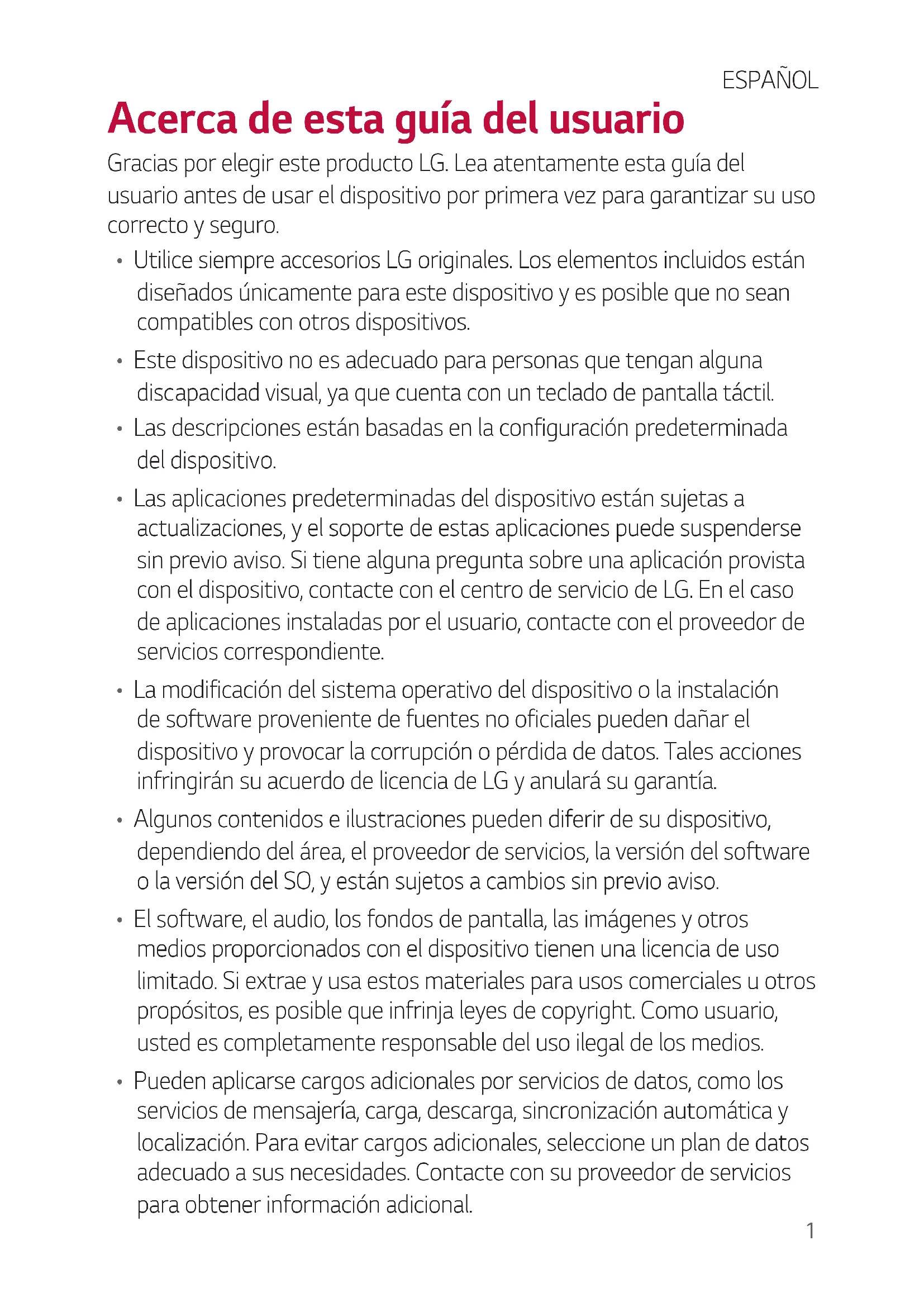 - La modificación del sistema operativo del dispositivo o la instalación de sof tware proveniente de fuentes no oficiales pueden dañar el dispositivo y provocar la corrupción o pérdida de datos. Tales acciones infringirán su acuerdo de licencia de LG y anulará su garantía.
