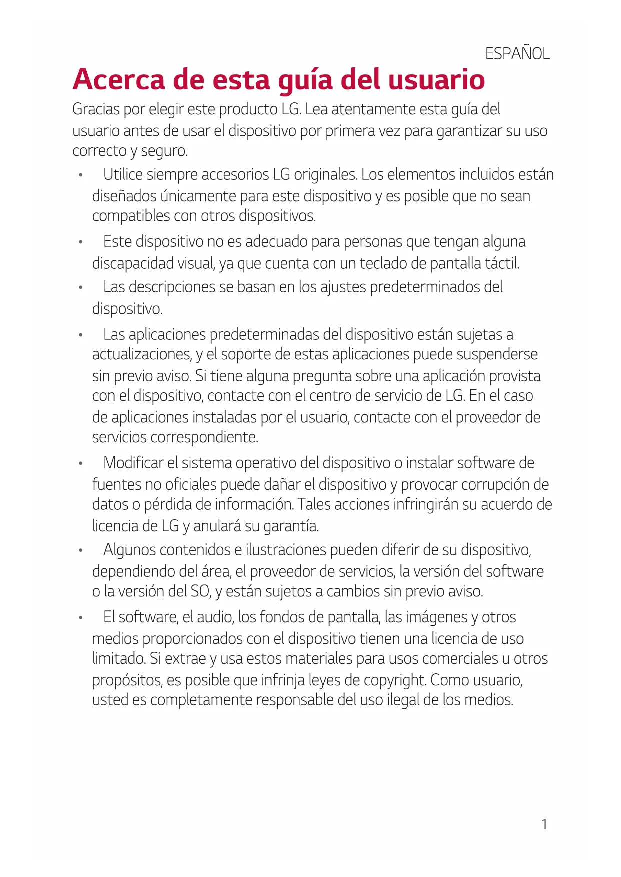 - Modificar el sistema operativo del dispositivo o instalar software de fuentes no oficiales puede dañar el dispositivo y provocar corrupción de datos o pérdida de información. Tales acciones infringirán su acuerdo de licencia de LG y anulará su garantía.