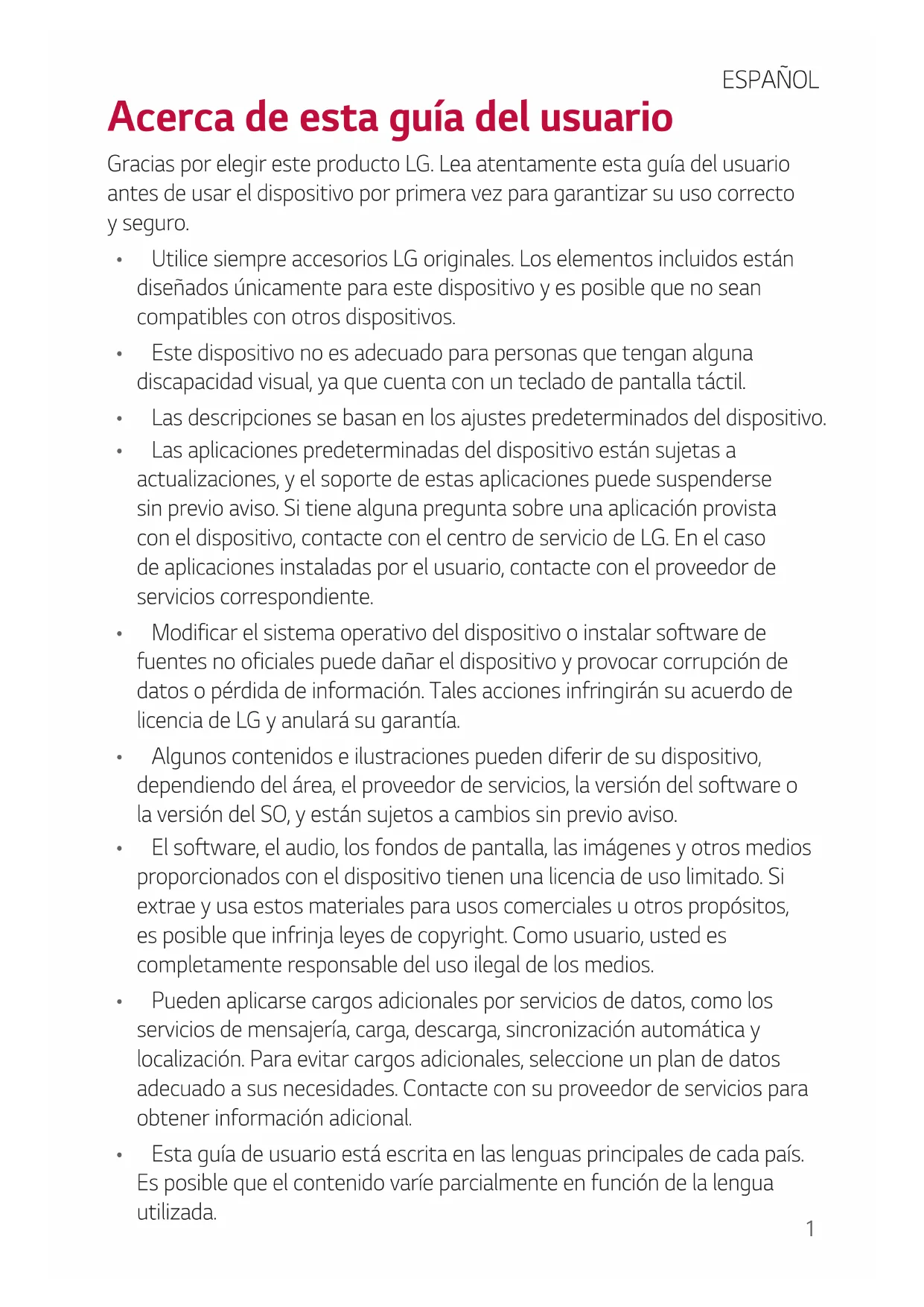 - Modificar el sistema operativo del dispositivo o instalar software de fuentes no oficiales puede dañar el dispositivo y provocar corrupción de datos o pérdida de información. Tales acciones infringirán su acuerdo de licencia de LG y anulará su garantía.