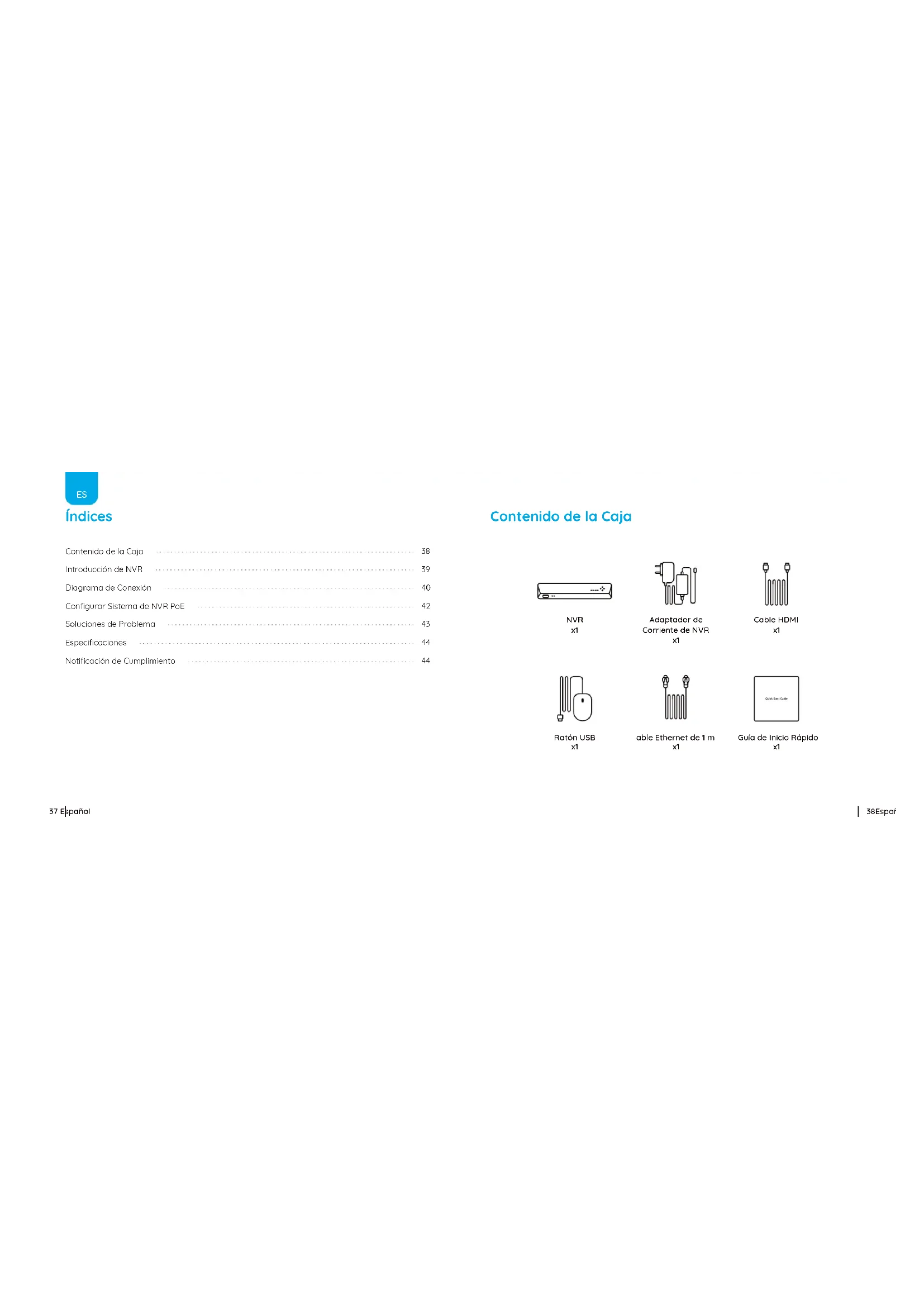 - Reinicie su NVR y enrutador e inténtelo de nuevo. Si aún no funciona, comuníquese con Soporte de Reolink https://support.reolink.com Descodificación Resolución de Decodificación: 12MP/8MP/5MP/4MP/3MP/1080p/720p Formato de Video: H.264,H.265 Reproducción Sincrónica: Hasta 4 Canales General Temperatura de Funcionamiento: -10°C a 45°C (-10°C a 55°C para RLN16-410) Tamaño: 260 x 41 x 230mm, (330 x 45 x 285mm para RLN16-410) Peso: 2.0kg, (3.0kg para RLN16-410) Especificaciones Salida de HDMI: Hasta 8MP Salida de VGA: Hasta 2MP Salida de Audio: 1-Canal RCA Salida de Video/Audio Notificación de Cumplimiento Declaración de Cumplimiento de la FCC El dispositivo cumple con la Parte 15 de las Reglas de la FCC. El funcionamiento está sujeto a las siguientes dos condiciones: (1) el dispositivo no puede causar interferencias perjudiciales. y (2) este dispositivo debe aceptar cualquier interferencia recibida, incluidas las interferencias que puedan causar una operación no deseada. Para obtener más información, consulte: https://reolink.com/fcc-compliance-notice/. Reolink declara que este dispositivo cumple con los requisitos esenciales y otras disposiciones relevantes de la Directiva 2014/30/UE. Declaración de Conformidad de la UE Simplificada 44Español43 EspañolEsta marca indica que este producto no debe desecharse con otros desechos domésticos en toda la UE. Para evitar posibles daños al medio ambiente o la salud humana derivados de la eliminación no controlada de residuos, recíclelo de manera responsable para promover la reutilización sostenible de los recursos materiales. Para devolver su dispositivo usado, utilice los sistemas de devolución y recolección o comuníquese con el vendedor donde compró el producto. Pueden eliminar este producto para un reciclaje de manera segura para el medio ambiente. Deshecho Correcto de este Producto Este producto viene con una garantía limitada de 2 años. Descubra más: https://reolink.com/warranty-and-return/. Garantía Limitada El uso del producto está sujeto a su aceptación de los Términos de Servicio y la Política de Privacidad en reolink.com. Manténgalo fuera del alcance de los niños. Al utilizar el Software del producto que está integrado en el producto Reolink, usted acepte los términos de este Contrato de Licencia de Usuario Final ("EULA") entre usted y Reolink. Obtenga más información: https://reolink.com/eula/. Términos y Privacidad Contrato de Licencia de Usuario Final 45 Español NOTA: Esperamos que disfrute de la nueva compra. Pero si no está satisfecho con el producto y planea devolverlo, le recomendamos encarecidamente que formatee el disco duro insertado antes de devolverlo.