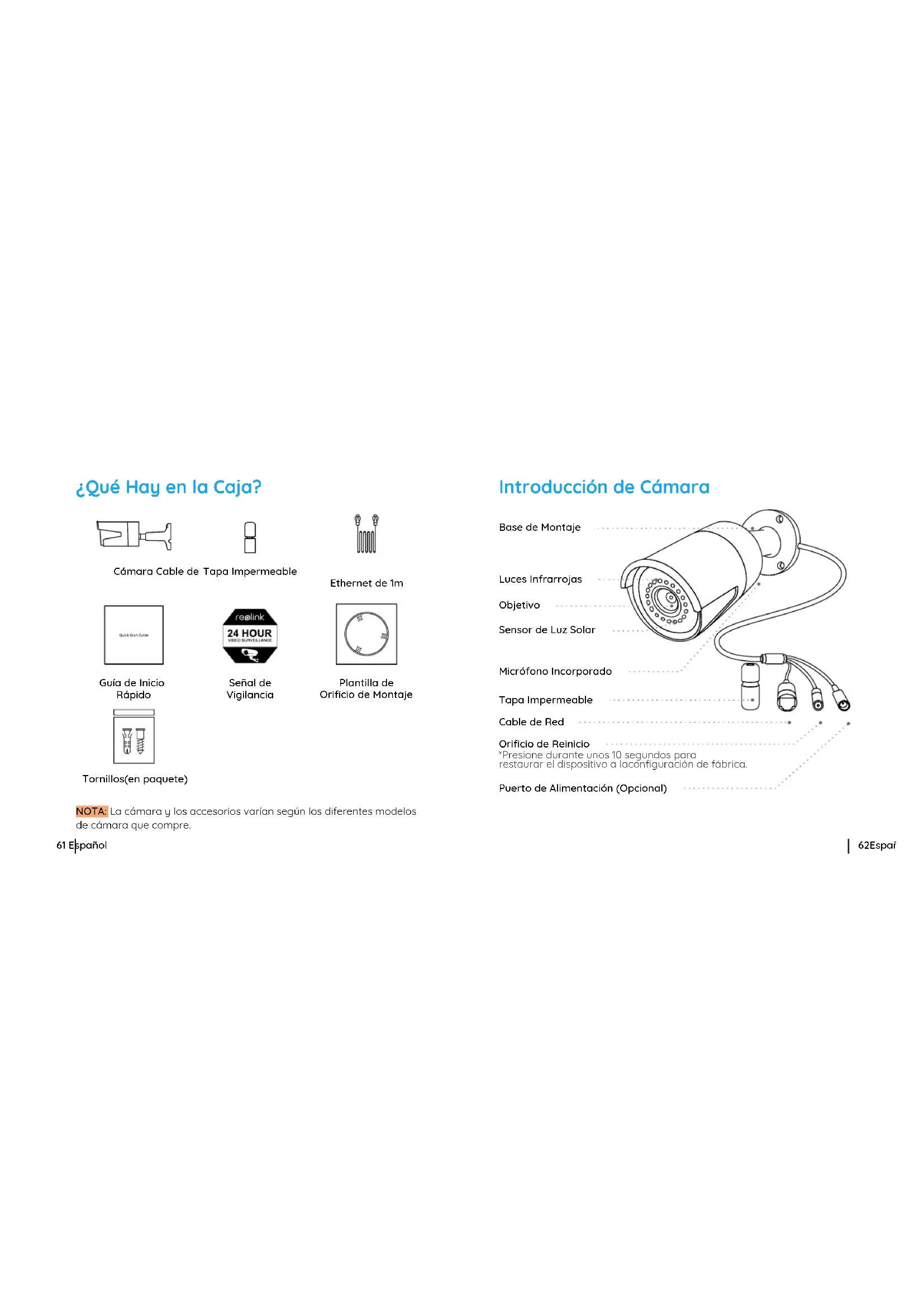 ¿Qué Hay en la Caja? Introducción de Cámara Diagrama de Conexión Configure la Cámara Monte la Cámara Solución de Problemas Especificaciones Notificación de Cumplimiento