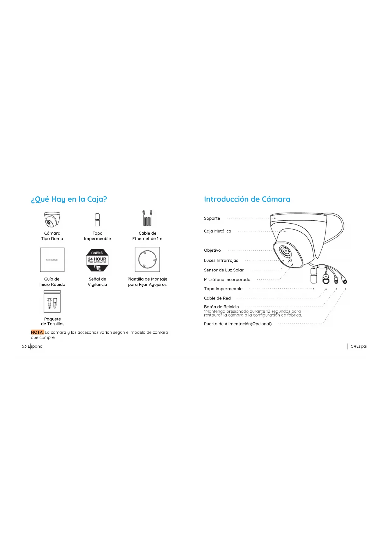 L'utilizzo del prodotto è soggetto all'accettazione dei Termini di servizio e dell'Informativa sulla privacy su reolink.com. Tenere fuori dalla portata dei bambini. Termini e Privacy Utilizzando il software prodotto incorporato al prodotto Reolink, voi accettate i termini di questo accordo di licenza per l’utente finale (“EULA”) fra voi e Reolink. Scopri di più: https://reolink.com/eula/. telecamera alle impostazioni di fabbrica predefinite ed estrarre la scheda SD inserita prima della restituzione. Contratto di Licenza per l’utente Finale54Español 53 Español ¿Qué Hay en la Caja? Cámara Tipo Domo Cable de Ethernet de 1m Tapa Impermeable Guía de Inicio Rápido Señal de Vigilancia Plantilla de Montaje para Fijar Agujeros Paquete de Tornillos Introducción de Cámara NOTA: La cámara y los accesorios varían según el modelo de cámara que compre. Objetivo Caja Metálica Tapa Impermeable Cable de Red Botón de Reinicio Puerto de Alimentación(Opcional) Soporte Luces Infrarrojas Sensor de Luz Solar Micrófono Incorporado *Mantenga presionado durante 10 segundos para restaurar la cámara a la configuración de fábrica.56Español 55 Español Descargue e inicie la aplicación de Reolink o el software de Client, y siga las instrucciones en pantalla para finalizar la configuración inicial. Configure La cámara Diagrama de Conexión Antes de usar la cámara, conecte su cámara como se indica a continuación para finalizar la configuración inicial.