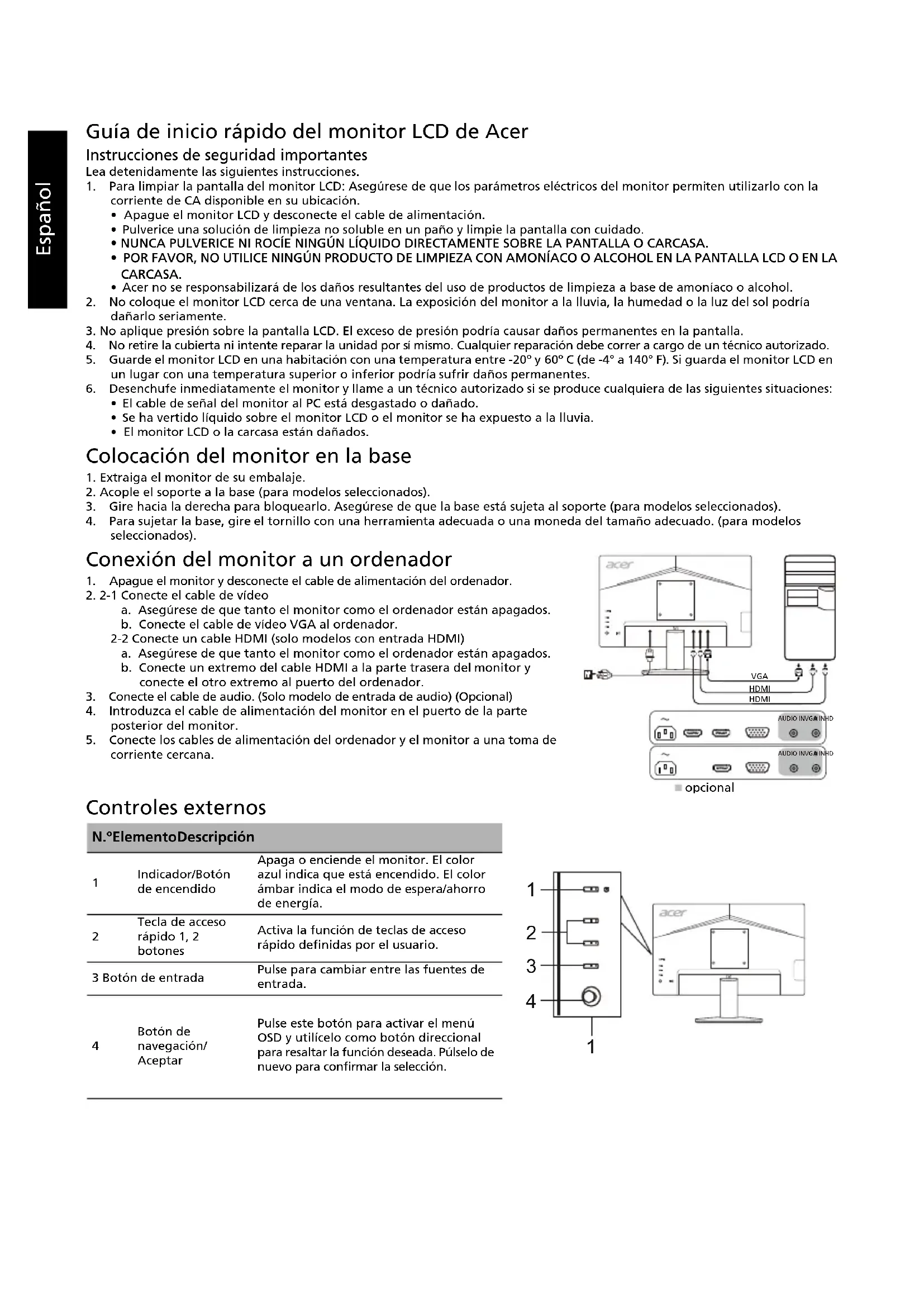 4Español Normativa y avisos de seguridad Aviso de la FCC Este dispositivo se ha probado y comprobado que cumple con los límites para un dispositivo digital de Clase B conforme a la Parte 15 de las normas de la FCC. Estos límites están diseñados para proporcionar una protección razonable frente a interferencias dañinas en una instalación residencial. Este dispositivo genera, utiliza y puede irradiar energía de radiofrecuencia y, si no se instala ni utiliza conforme a las instrucciones, podría causar interferencias dañinas en las comunicaciones de radio. No obstante, no puede garantizarse que las interferencias no se produzcan en instalaciones concretas. Si este dispositivo causa interferencias dañinas en la recepción de radio o televisión, lo que puede determinarse apagando y encendiendo el dispositivo, el usuario puede intentar solucionar las interferencias de las siguientes maneras: Cambiar la orientación de la antena receptora o colocarla en otro lugar. Aumentar la separación entre el dispositivo y el receptor. Conectar el dispositivo a una toma de corriente en un circuito distinto al que se ha conectado el receptor. Consulte con el distribuidor o un técnico especializado en radio y televisión para recibir asistencia. Declaración de conformidad CE Por la presente, Acer Inc. declara que este monitor LCD cumple con los requisitos y otras provisiones relevantes de la directiva EMC 2014/30/EU, la directiva de bajo voltaje 2014/35/EU, la directiva RoHS 2011/65/EU y la directiva 2009/125/EC relacionadas con la creación de un marco para el establecimiento de requisitos de ecodiseño para productos relacionados con la energía. Aviso: Para evitar daños en el monitor, no lo levante sujetándolo por la base. Aviso: Cables blindados Las conexiones a otros dispositivos informáticos deben realizarse con cables blindados, a fin de cumplir con las normativas de la EMC. Aviso: Dispositivos periféricos Solo deben conectarse a este equipo aquellos periféricos (dispositivos de entrada/salida, terminales, impresoras, etc.) certificados que cumplan con los límites de la Clase B. Si se utiliza con periféricos sin certificación, es posible que se produzcan interferencias en la recepción de radio y televisión. Precaución Cualquier cambio o modificación no aprobado expresamente por el fabricante podría anular la autoridad del usuario, concedida por la Comisión Federal de Comunicaciones, para utilizar el producto. Condiciones de funcionamiento Este dispositivo cumple con la Parte 15 de las normas de la FCC. El funcionamiento está sujeto a las siguientes condiciones: (1) este dispositivo no puede causar interferencias dañinas y (2) este dispositivo debe aceptar cualquier interferencia recibida, incluidas aquellas que puedan provocar un funcionamiento no deseado. Aviso: Usuarios de Canadá Este aparato digital de Calse B cumple con la normativa canadiense ICES-003. Remarque à l'intention des utilisateurs canadiens Cet appareil numérique de la classe B est conforme à la norme NMB-003 du Canada. Eliminación de equipo obsoleto por parte de los usuarios en una vivienda privada en la Unión Europea La aparición de este símbolo en el producto o su embalaje indica que no es posible eliminarlo con el resto de residuos domésticos. En su lugar, el usuario es responsable de eliminar el equipo obsoleto llevándolo a un punto de recogida designado para el reciclaje de equipo eléctrico y electrónico. El reciclaje y la recogida por separado del equipo obsoleto en el momento de su eliminación ayudarán a conservar los recursos naturales y garantizar que se recicla de una forma que proteja la salud humana y el medio ambiente. Para obtener más información sobre dónde puede llevar su equipo obsoleto para reciclarlo, póngase en contacto con el ayuntamiento de su localidad, el servicio de eliminación de residuos o el establecimiento donde compró el producto.Español ESPECIFICACIONES Puede encontrar manuales y otros documentos para su producto de Acer en el sitio web oficial de asistencia de Acer. Panel LCD Sistema de conducción Pantalla LCD TFT en color Tamaño 23,8”W (60 cm) Distancia entre píxeles 0,2745 mm (horizontal) x 0,2745 mm (vertical) Brillo 250 cd/m