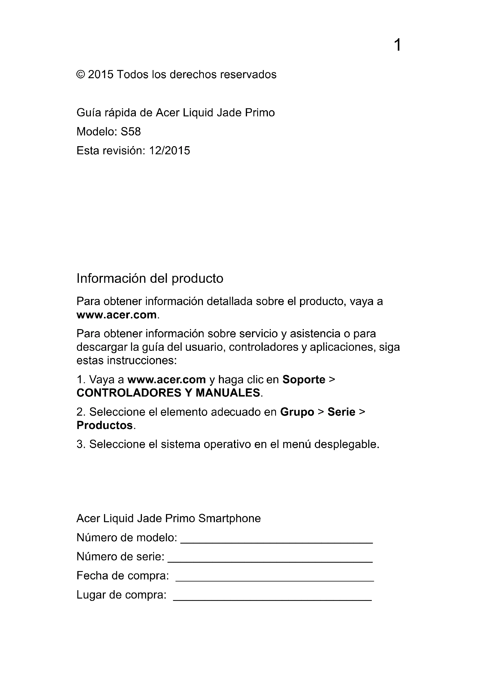 © 2015 Todos los derechos reservados Guía rápida de Acer Liquid Jade Primo Modelo: S58 Esta revisión: 12/2015 Acer Liquid Jade Primo Smartphone Número de modelo: ______________________________ Número de serie: ________________________________ Fecha de compra: _______________________________ Lugar de compra: _______________________________2 Español Su teléfono