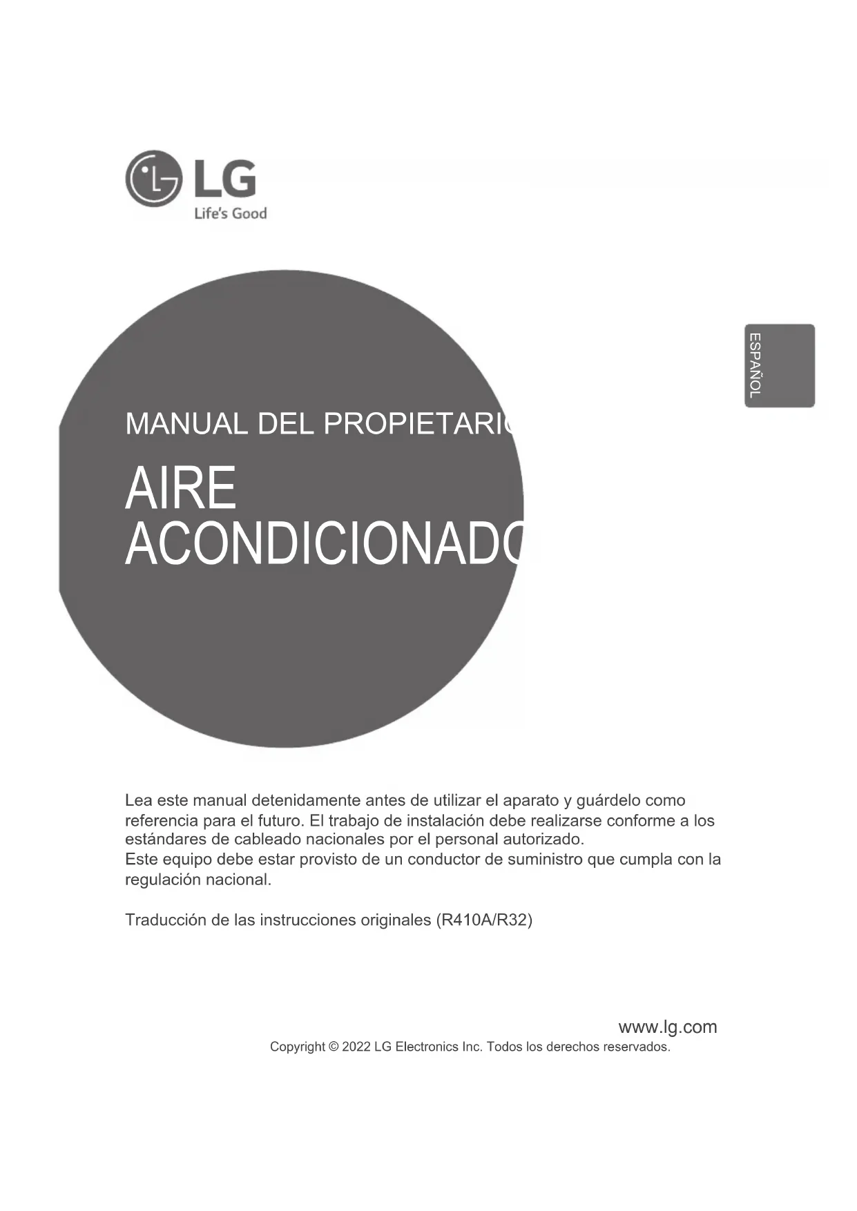 Lea este manual detenidamente antes de utilizar el aparato y guárdelo como referencia para el futuro. El trabajo de instalación debe realizarse conforme a los estándares de cableado nacionales por el personal autorizado. Este equipo debe estar provisto de un conductor de suministro que cumpla con la regulación nacional. Traducción de las instrucciones originales (R410A/R32) AIRE ACONDICIONADO Copyright © 2022 LG Electronics Inc. Todos los derechos reservados. ESPAÑOL2 Unidad interior Índice