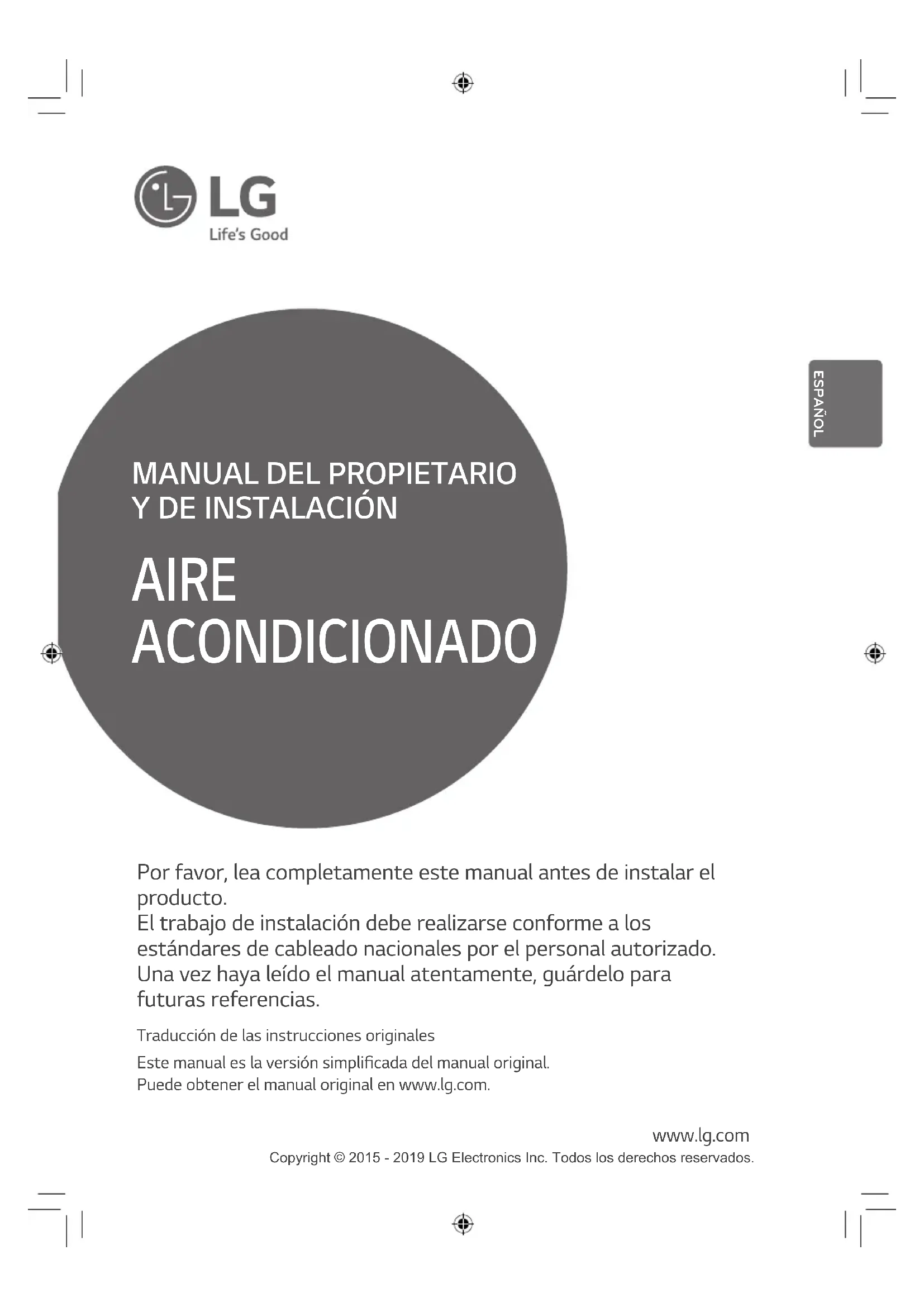 Traducción de las instrucciones originales Este manual es la versión simplificada del manual original. Puede obtener el manual original en www.lg.com. AIRE ACONDICIONADO www.lg.com Por favor, lea completamente este manual antes de instalar el producto. El trabajo de instalación debe realizarse conforme a los estándares de cableado nacionales por el personal autorizado. Una vez haya leído el manual atentamente, guárdelo para futuras referencias. Copyright © 2015 - 2019 LG Electronics Inc. Todos los derechos reservados. ESPAÑOL2