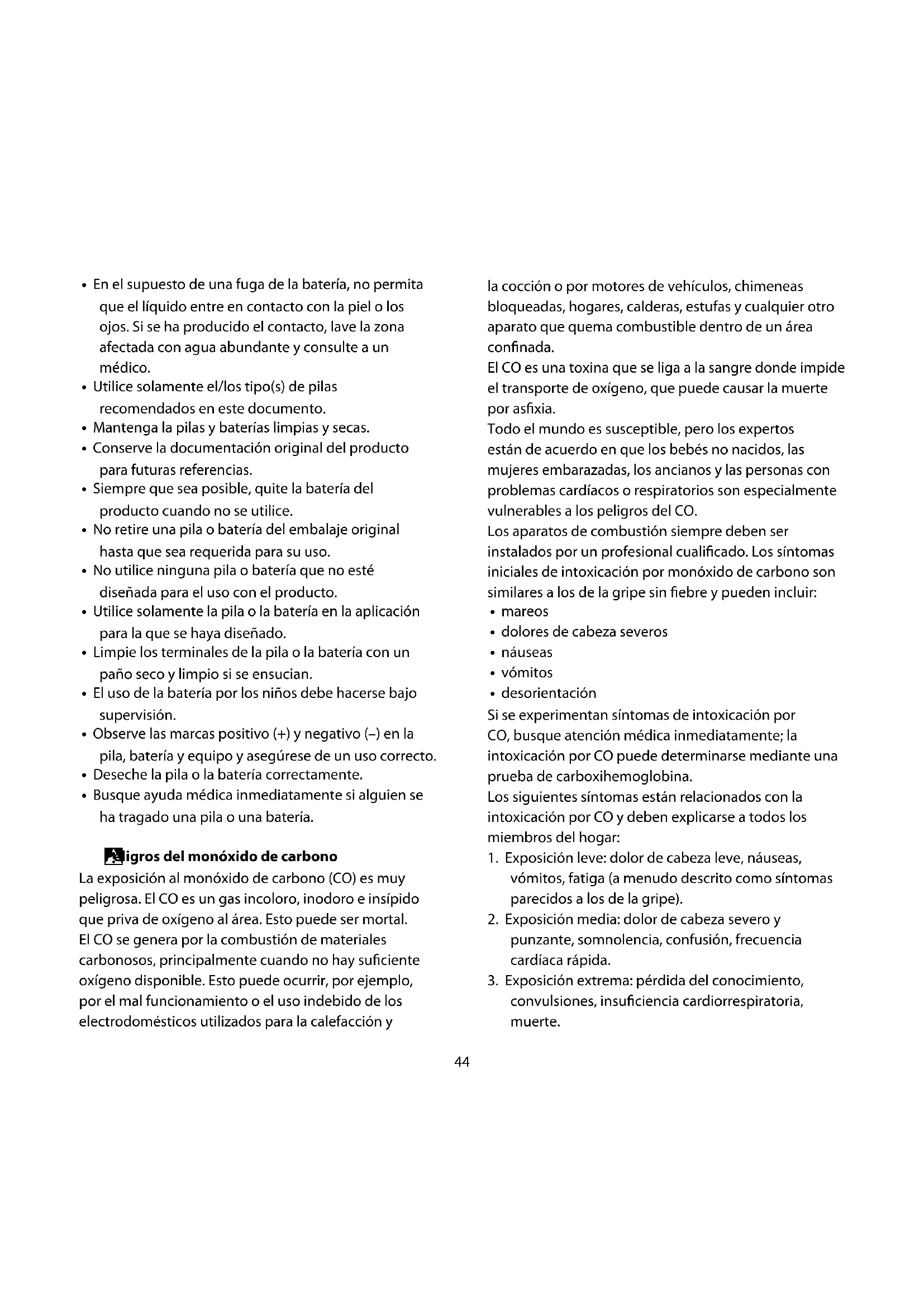 Peligros del monóxido de carbono La exposición al monóxido de carbono (CO) es muy peligrosa. El CO es un gas incoloro, inodoro e insípido que priva de oxígeno al área. Esto puede ser mortal. El CO se genera por la combustión de materiales carbonosos, principalmente cuando no hay suciente oxígeno disponible. Esto puede ocurrir, por ejemplo, por el mal funcionamiento o el uso indebido de los electrodomésticos utilizados para la calefacción y la cocción o por motores de vehículos, chimeneas bloqueadas, hogares, calderas, estufas y cualquier otro aparato que quema combustible dentro de un área connada. El CO es una toxina que se liga a la sangre donde impide el transporte de oxígeno, que puede causar la muerte por asxia. Todo el mundo es susceptible, pero los expertos están de acuerdo en que los bebés no nacidos, las mujeres embarazadas, los ancianos y las personas con problemas cardíacos o respiratorios son especialmente vulnerables a los peligros del CO. Los aparatos de combustión siempre deben ser instalados por un profesional cualicado. Los síntomas iniciales de intoxicación por monóxido de carbono son similares a los de la gripe sin ebre y pueden incluir: