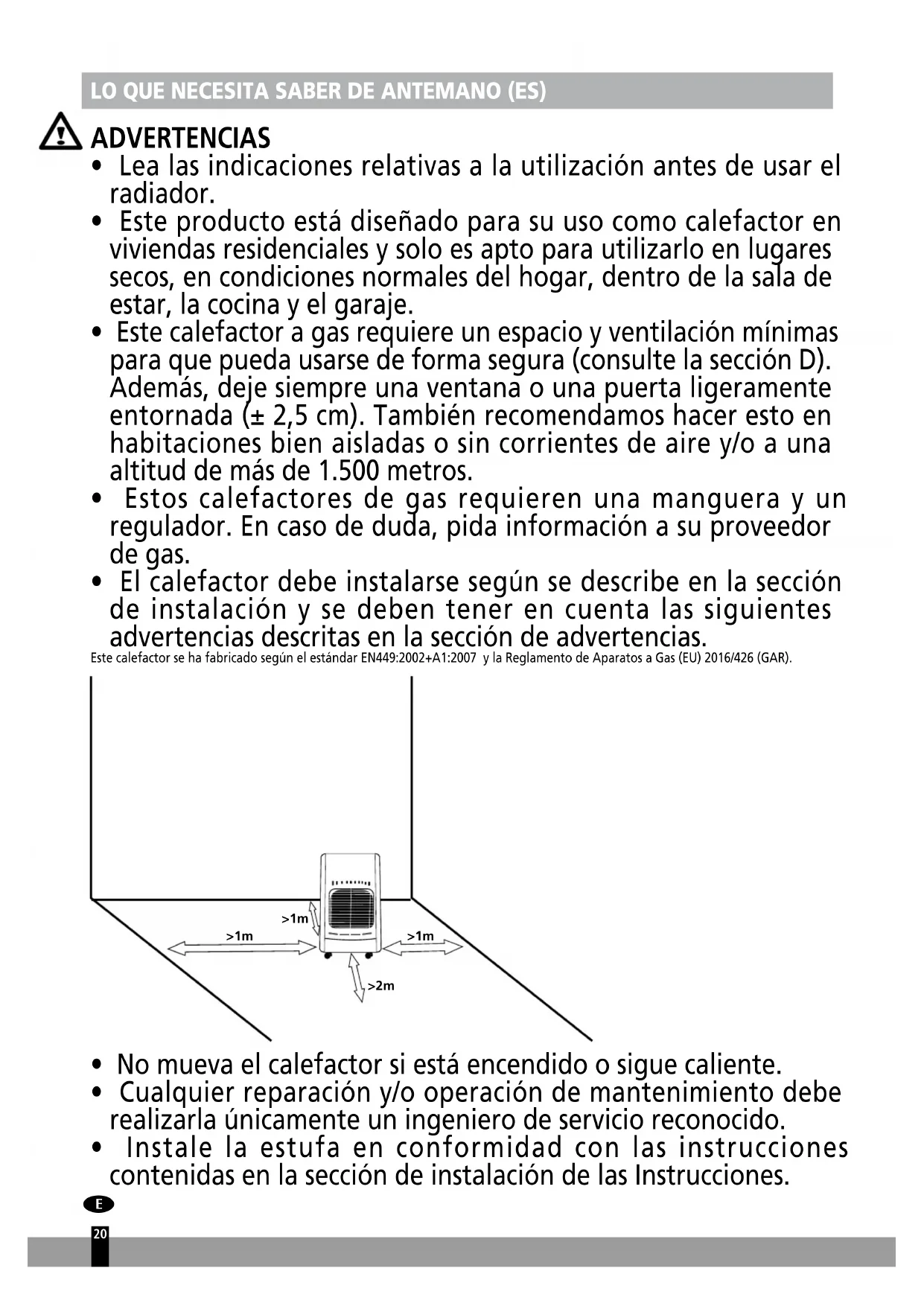 - El calefactor debe instalarse según se describe en la sección de instalación y se deben tener en cuenta las siguientes advertencias descritas en la sección de advertencias. Este calefactor se ha fabricado según el estándar EN449:2002+A1:2007 y la Reglamento de Aparatos a Gas (EU) 2016/426 (GAR).