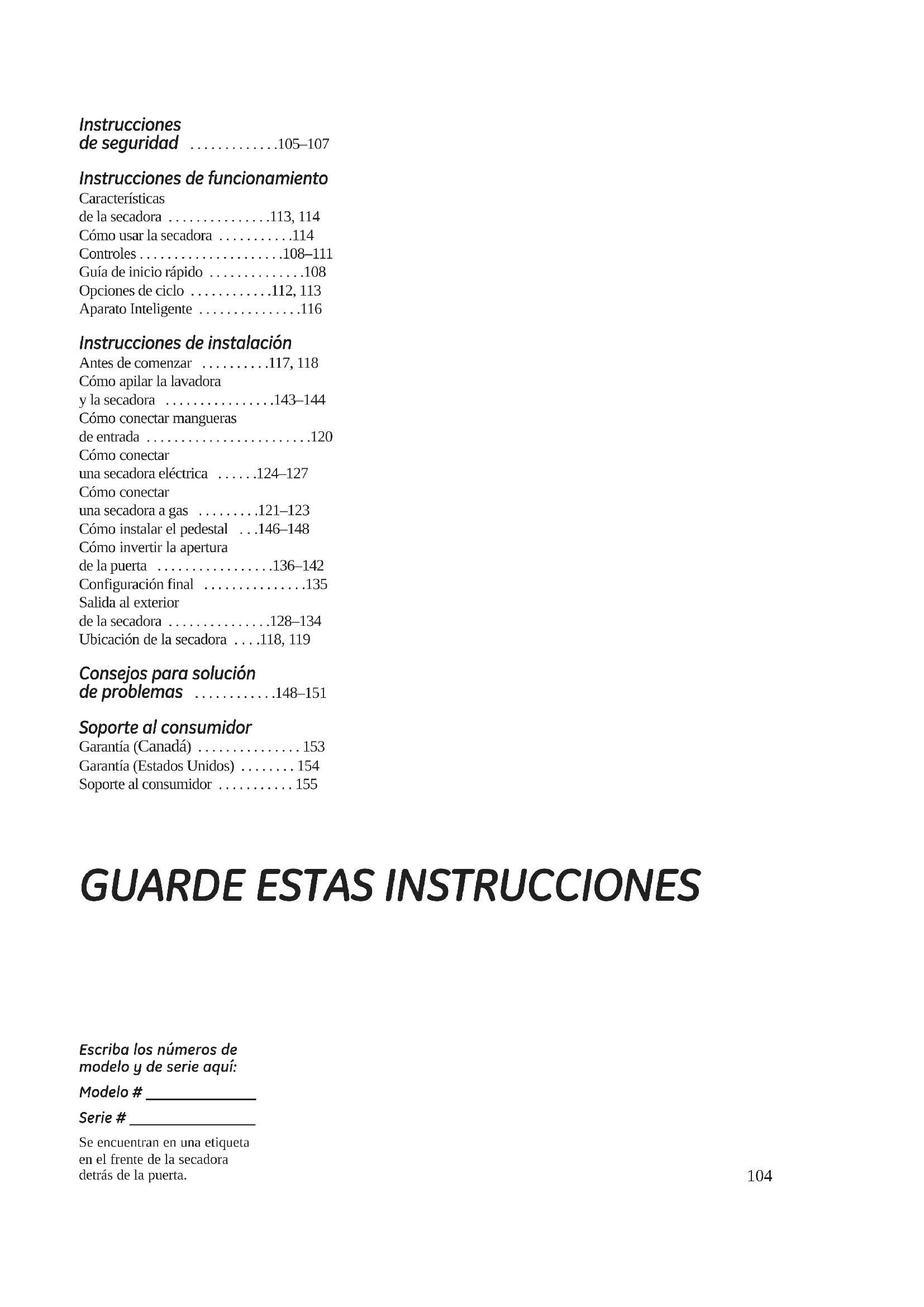 Esta secadora debe instalarse de manera adecuada y ubicarse de acuerdo con las Instrucciones de Instalación antes de comenzar el uso. Las Instrucciones de instalación están incluidas en la parte trasera de esta manual. No almacene o use gasolina u otros vapores o líquidos inflamables cerca de este o cualquier otro artefacto.