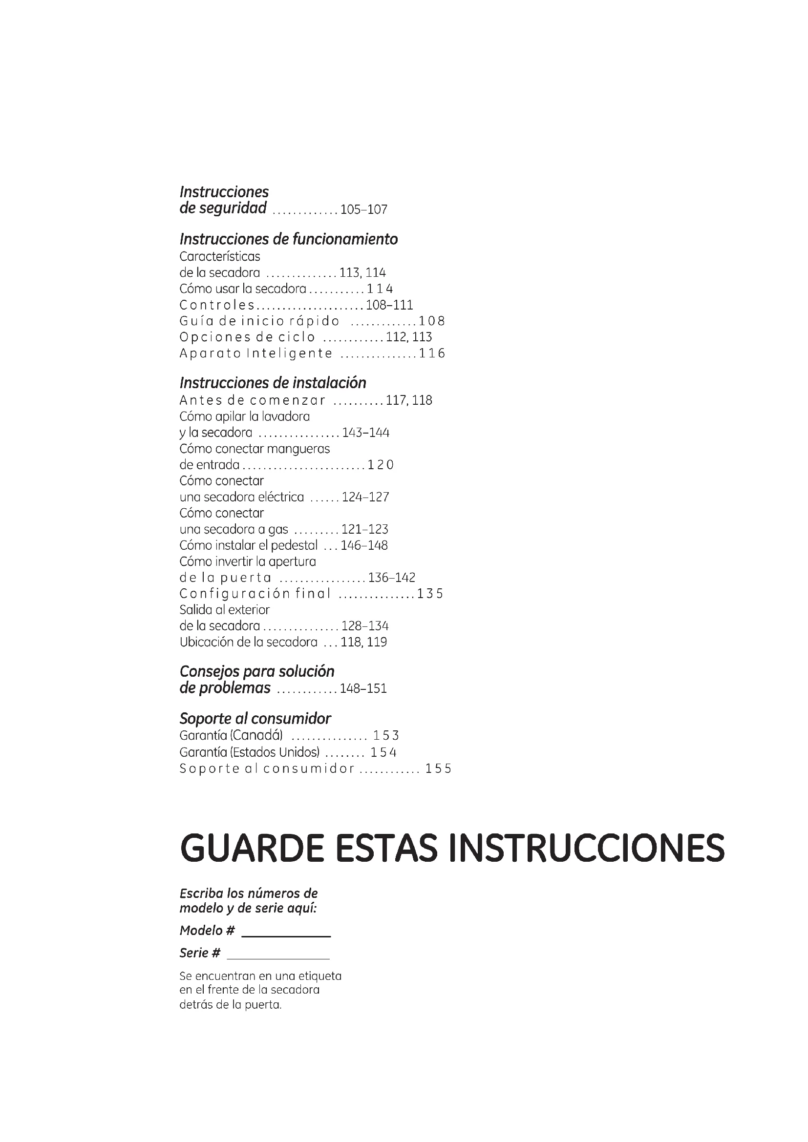 Para programar servicio de asistencia técnica, en línea, visite la página GEAppliances.com o llame al 800.GE.CARES (1.800.432.2737). Cuando llame para solicitar servicio, por favor tenga a mano el número de serie y el número de modelo. Esta garantía se extiende al comprador original y cualquier comprador posterior de productos comprados para uso residencial dentro des Estados Unidos. Si el producto está situado en un área que no dispone de servicio por parte de un proveedor de servicio autorizado de GE, podría tener que hacerse cargo de los costes de envío o bien podría solicitársele que lleve el producto a una centro de servicio de GE autorizado para realizar la reparación. En Alaska, la garantía excluye el costo de envío o las visitas de servicio a su casa. Algunos estados no permiten la exclusión o las limitaciones de daños incidentales o consecuenciales. Esta garantía da derechos legales específicos, y usted podría tener otros derechos que variarán de estado a estado. Para saber cuáles son sus derechos legales, consulte a la oficina de asuntos del consumidor local o la oficina del Prucurador (Attorney General) en su localidad. Engrape el recibo aquí. Se necesita el comprobante con la fecha de compra original para que la garantía cubra los servicios. Un año Cualquier pieza de la secadora que falle debido a un defecto de los materiales o mano Desde la fecha de de obra. Durante esta garantía limitada de un año, GE también ofrece, en forma gratuita, compra original toda la mano de obra y los costos de servicio para reemplazar la pieza defectuosa. Segundo año Cualquier pieza de la secadora que falle debido a un defecto de los materiales o mano de obra. Desde la fecha de Durante esta garantía limitada adicional de un año, usted será responsable de cualquier clase compra original de costos de mano de obra o de servicios relacionados. Del segundo al El tambor de secado extra grande o de súper capacidad y la placa electrónica principal de quinto año control si alguna de estas piezas fallara debido a un defecto de materiales o mano de obra. Durante Desde la fecha de esta garantía limitada adicional de cuatro años, usted será responsable de cualquier clase de costos compra original de mano de obra o de servicios relacionados. (;&/86,Ï1'(*$5$17Ë$6,03/Ë&,7$6³6X~QLFR\H[FOXVLYRGHUHFKRHVODUHSDUDFLyQGHOSURGXFWRWDO\ como se indica en esta Garantía limitada. Cualquier garantía implícita, incluyendo las garantías implícitas de comerciabilidad o adecuación para un fin determinado, están limitadas a un año o el período de tiempo más breve permitido por la ley. Visitas a su hogar para enseñarle a usar el producto. Instalación, entrega o mantenimiento inadecuados. Fallas del producto debido a abuso, uso indebido, uso diferente para el que fue diseñado, o uso comercial. Recambio de la bombilla de luz después de su vida útil esperada. Reemplazo de fusibles domésticos o la reconfiguración de los interruptores de circuito. Daños al producto provocados por accidentes, incendios, inundaciones o fuerza mayor. Daños incidentales o resultantes provocados por posibles defectos en este artefacto. Daños provocados después de la entrega. Producto no accesible para prestar el servicio técnico solicitado. Defectos o daños causados por la operación en temperaturas bajo cero C. Productos que no están defectuosos o dañados o que funcionan según la descripción del Manual del usuario. No se encuentra cubierto:Apoyo al cliente. Sitio Web de GE Appliances En los EE.UU.: GEAppliances.com ¿Tiene una consulta o necesita ayuda con su aparato? ¡Visite el Sitio Web de GE Appliances las 24 horas al día, todos los días del año! Para una mayor comodidad y un servicio más rápido, ahora usted puede bajar los Manuales del Propietario, solicitar piezas o programar atención on-line. En Canadá: www.GEAppliances.ca. Programe una reparación En los EE.UU.: GEAppliances.com El servicio experto de reparación de GE está sólo a un paso de su hogar. ¡Programe on-line el servicio técnico a su conveniencia cualquier día del año! O llame al 800.GE.CARES (800.432.2737) durante horario normal de trabajo. En Canadá, llame al 1.800.561.3344 Estudio de diseño para la vida real En los EE.UU.: GEAppliances.com GE apoya el concepto de Diseño Universal: Productos, servicios y ambientes que pueden ser utilizados por personas de todas las edades, tamaños y capacidades. Reconocemos la necesidad de la creación de diseños para una amplia gama de capacidades y limitaciones físicas y mentales. Para más detalles sobre las aplicaciones de Diseño Universal de GE, incluyendo ideas de diseño de cocina para personas con discapacidades, visite el Sitio Web hoy mismo. Para las personas con problemas auditivos, llame al 800.TDD.GEAC (800.833.4322). En Canadá, comuníquese con: Manager, Consumer Relations, Mabe Canada Inc. Suite 310, 1 Factory Lane Moncton, N.B. E1C 9M3 Garantías extendidas En los EE.UU.: GEAppliances.com Adquiera una garantía extendida de GE y averigüe sobre descuentos especiales disponibles durante la vigencia de su garantía. Usted puede adquirirla on-line en cualquier momento, o llamar al 800.626.2224 en horario normal de trabajo. El Servicio Doméstico al Consumidor de GE también lo ayudará después de que su garantía haya expirado. En Canadá, llame al 1.888.261.2133 Piezas y accesorios En los EE.UU.: GEApplianceparts.com Las personas calificadas para arreglar sus propios aparatos pueden recibir las piezas o accesorios directamente en sus hogares (se aceptan las tarjetas VISA, MasterCard y Discover). Solicítelos on-line hoy mismo, las 24 horas del día o por teléfono al 800.626.2002 en horario normal de trabajo. Las instrucciones incluidas en este manual cubren los procedimientos a realizar por cualquier usuario. Personal de servicio técnico calificado debe efectuar otra clase de arreglos. Debe tenerse mucho cuidado, porque los arreglos inadecuados pue