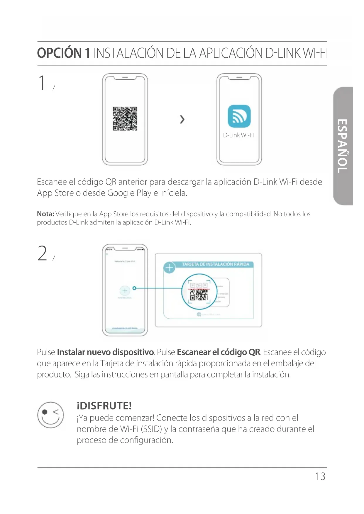 www.dlink.com Nombre de modelo: DISPOSITIVO Nombre Wi-Fi: d-link-XXXX Contraseña: XXXXXXXX N/S: 123456789 ¡DISFRUTE! ¡Ya puede comenzar! Conecte los dispositivos a la red con el nombre de Wi-Fi (SSID) y la contraseña que ha creado durante el proceso de configuración. D-Link Wi-FI14 ESPAÑOL OPCIÓN 2 INSTALACIÓN DEL NAVEGADOR WEB 1 / Instale las antenas. Si las antenas ya están colocadas, sitúe el router cerca del módem conectado a Internet. Mantenga el router en una zona abierta para conseguir una mejor cobertura inalámbrica. 2 / Conecte un cable Ethernet del módem al puerto que lleva la etiqueta INTERNET del router. Nota: Si el router no incluye un puerto con la etiqueta INTERNET, conecte el cable Ethernet al puerto de LAN 1. Módem Puerto de LAN 1 3 / Conecte el router a una toma de alimentación para encenderlo. Asegúrese de que el botón de encendido se encuentre en la posición "On". Internet Módem 4 3 2 1 INTERNET RESETWPS12VDCINPOWER15 ESPAÑOL ¡DISFRUTE! ¡Ya puede comenzar! Conecte los dispositivos a la red con el nombre de Wi-Fi (SSID) y la contraseña que ha creado durante el proceso de configuración. Conecte el ordenador a la red Wi-Fi con el nombre y la contraseña que aparecen en la Tarjeta de instalación rápida o bien en la etiqueta del dispositivo situada en la parte inferior del mismo. Escriba http://dlinkrouter.local./ en la barra de direcciones de un navegadores web. Siga las instrucciones en pantalla para completar la instalación. 4 / Espere a que los LED 2.4 GHz y 5 GHz inalámbricos se enciendan. Nota: Si el router no tiene los LED inalámbricos 2.4 y 5G, consulte en el Manual del usuario el significado de los LED. 5 / 6 / http://dlinkrouter.local./