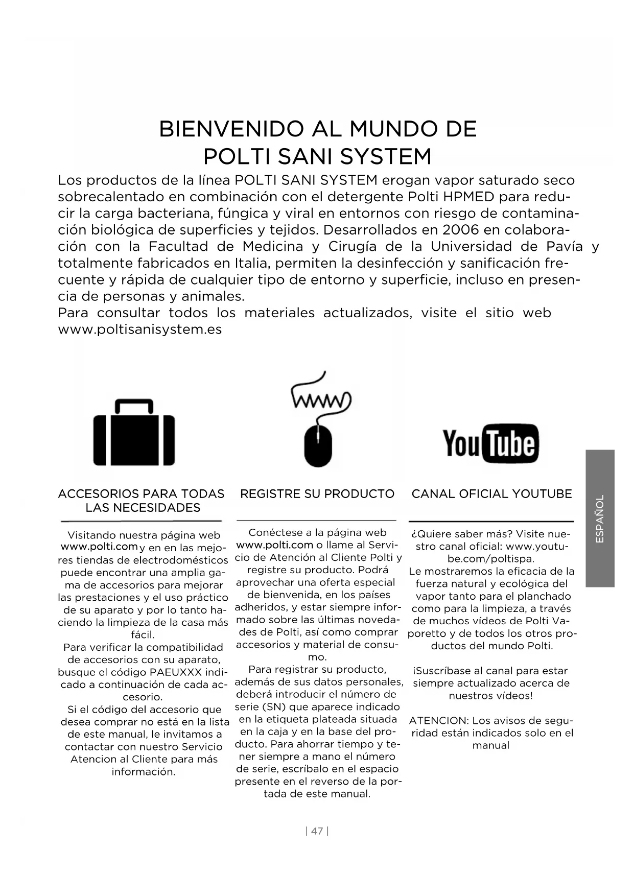¿Quiere saber más? Visite nue- stro canal oficial: www.youtu- be.com/poltispa. Le mostraremos la eficacia de la fuerza natural y ecológica del vapor tanto para el planchado como para la limpieza, a través de muchos vídeos de Polti Va- poretto y de todos los otros pro- ductos del mundo Polti. ¡Suscríbase al canal para estar siempre actualizado acerca de nuestros vídeos! ATENCION: Los avisos de segu- ridad están indicados solo en el manualADVERTENCIAS DE SEGURIDAD ADVERTENCIAS IMPORTANTES ATENCIÓN: ANTES DE UTILIZAR EL APARATO, LEA