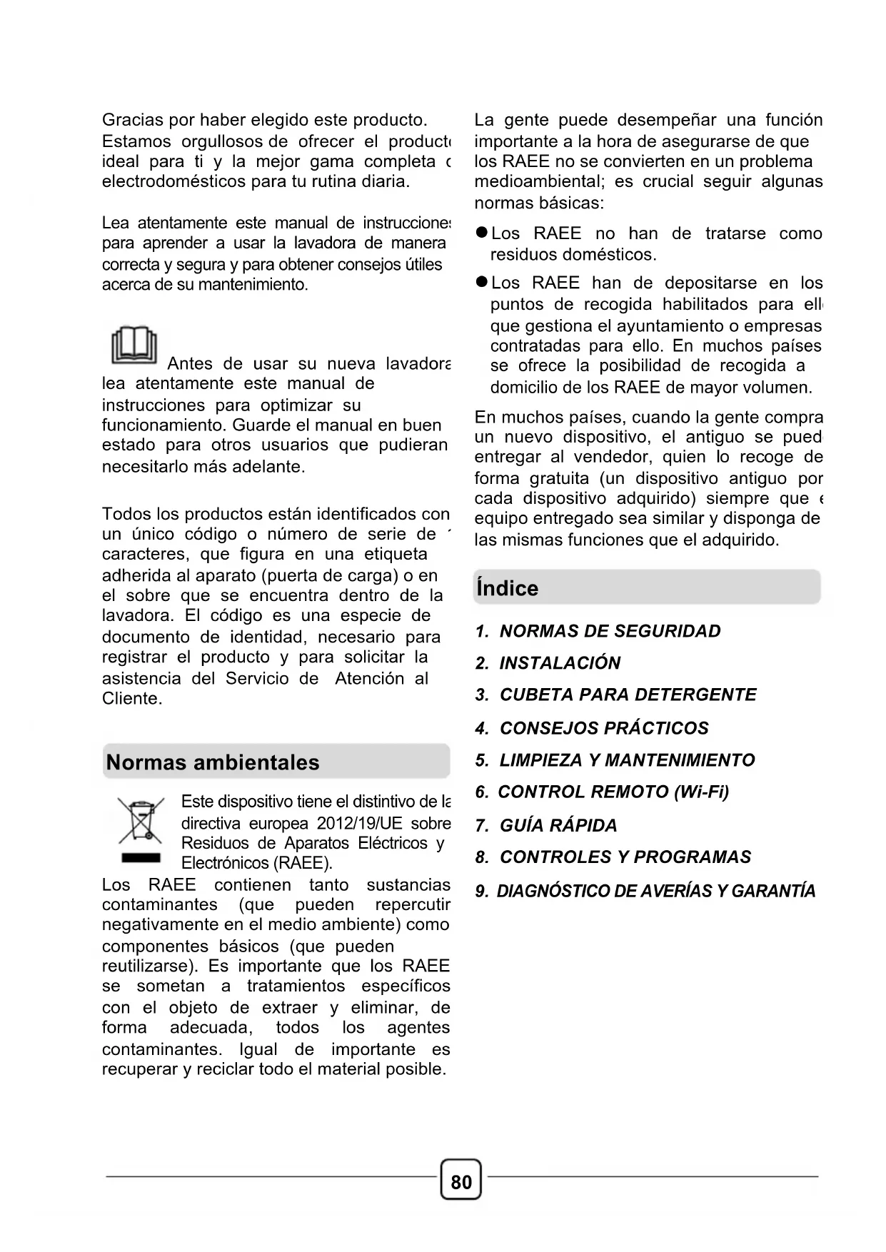 Gracias por haber elegido este producto. Estamos orgullosos de ofrecer el producto ideal para ti y la mejor gama completa de electrodomésticos para tu rutina diaria. Lea atentamente este manual de instrucciones para aprender a usar la lavadora de manera correcta y segura y para obtener consejos útiles acerca de su mantenimiento. Antes de usar su nueva lavadora, lea atentamente este manual de instrucciones para optimizar su funcionamiento. Guarde el manual en buen estado para otros usuarios que pudieran necesitarlo más adelante. Todos los productos están identificados con un único código o número de serie de 16 caracteres, que figura en una etiqueta adherida al aparato (puerta de carga) o en el sobre que se encuentra dentro de la lavadora. El código es una especie de documento de identidad, necesario para registrar el producto y para solicitar la asistencia del Servicio de Atención al Cliente.