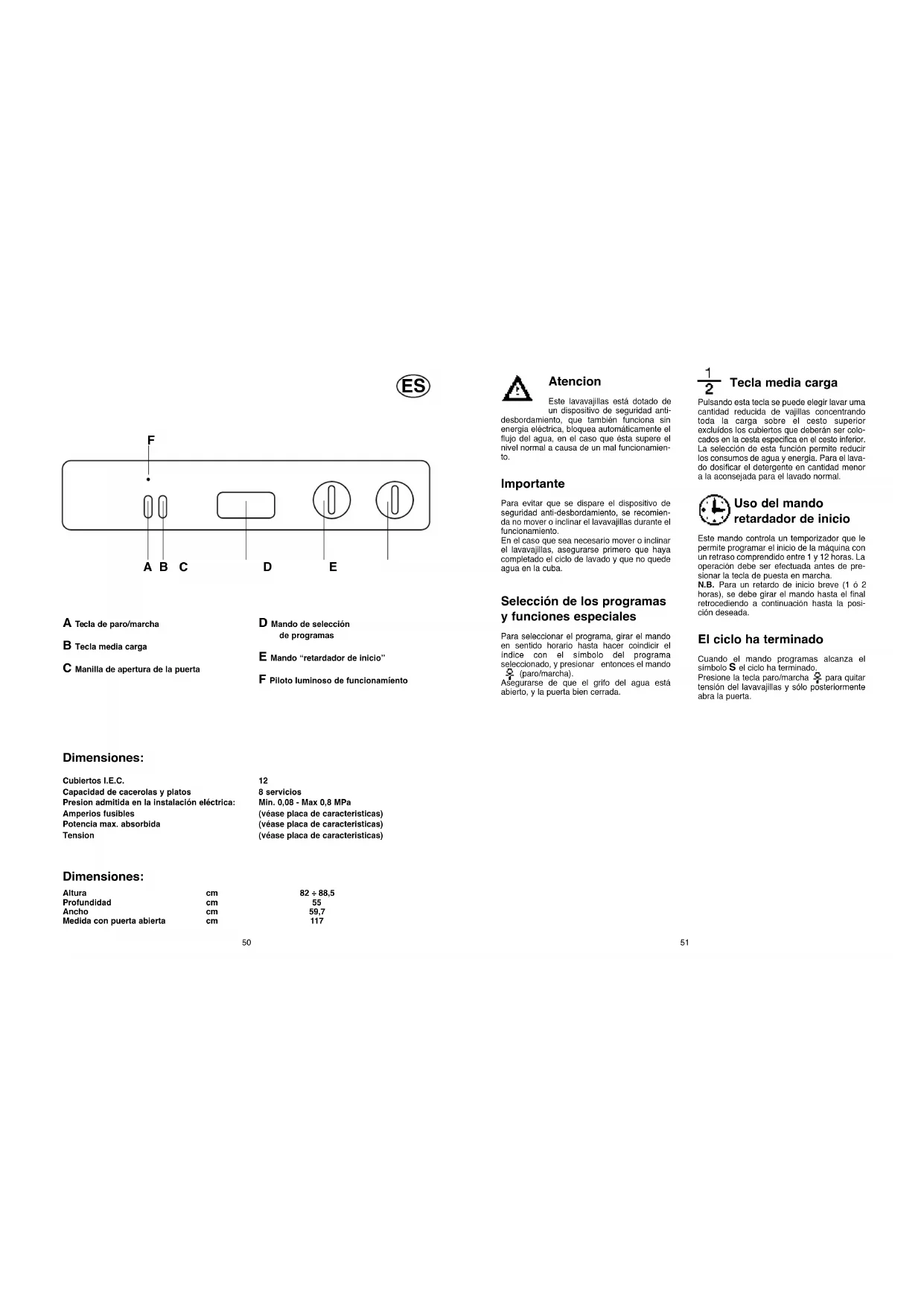 A Tecla de paro/marcha B Tecla media carga C Manilla de apertura de la puerta D Mando de selección de programas E Mando “retardador de inicio” F Piloto luminoso de funcionamíento 82 ÷ 88,5