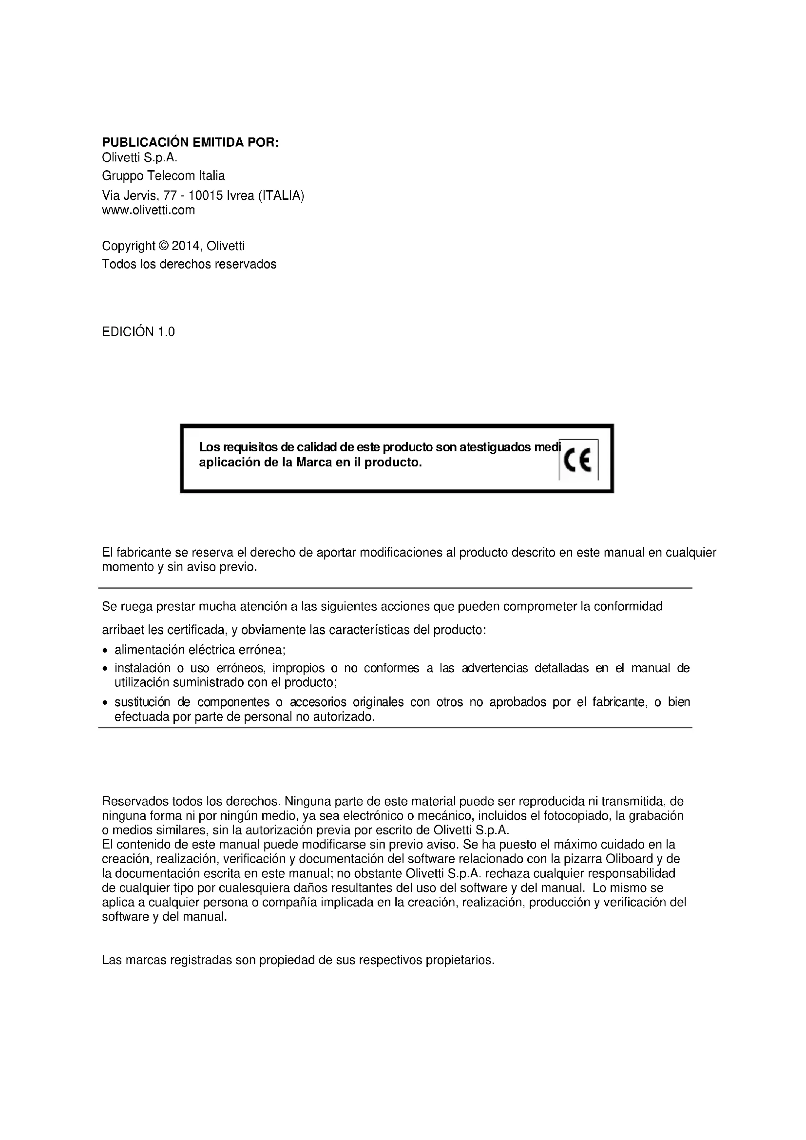 Reservados todos los derechos. Ninguna parte de este material puede ser reproducida ni transmitida, de ninguna forma ni por ningún medio, ya sea electrónico o mecánico, incluidos el fotocopiado, la grabación o medios similares, sin la autorización previa por escrito de Olivetti S.p.A. El contenido de este manual puede modificarse sin previo aviso. Se ha puesto el máximo cuidado en la creación, realización, verificación y documentación del software relacionado con la pizarra Oliboard y de la documentación escrita en este manual; no obstante Olivetti S.p.A. rechaza cualquier responsabilidad de cualquier tipo por cualesquiera daños resultantes del uso del software y del manual. Lo mismo se aplica a cualquier persona o compañía implicada en la creación, realización, producción y verificación del software y del manual.