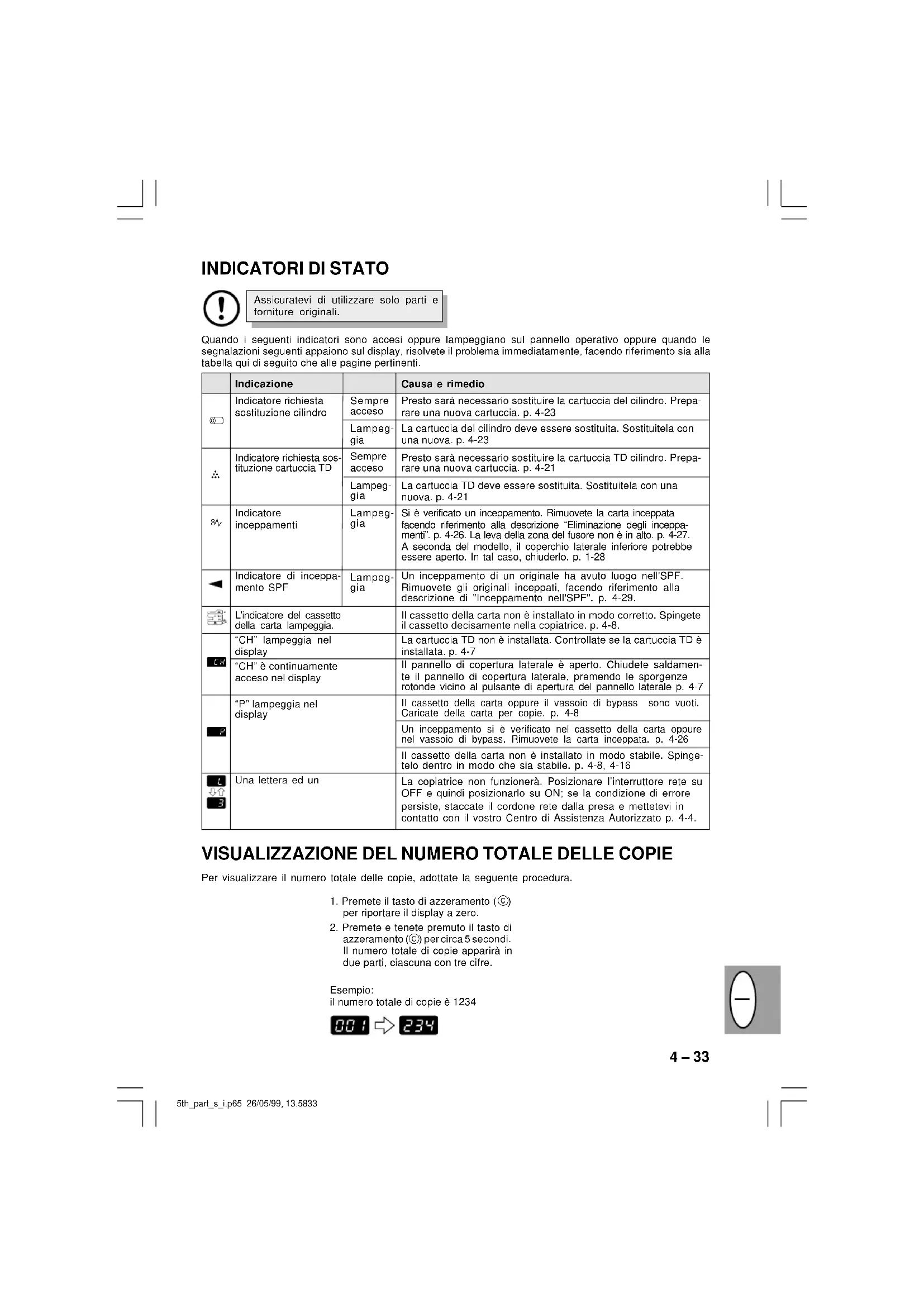 La copiadora asume los ajustes iniciales cuando la misma conmuta después de transcurrir un intervalo de tiempo previa- mente programado (tiempo de borrado automático) o tras la última copia. El visor muestra “0”. Sul display è visualizzato "0"