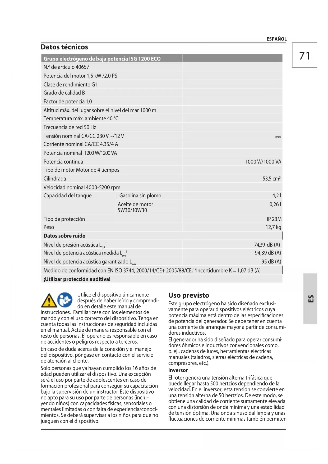 Datos técnicos Grupo electrógeno de baja potencia ISG 1200 ECO N.º de artículo 40657 Potencia del motor 1,5 kW /2,0 PS Clase de rendimiento G1 Grado de calidad B Factor de potencia 1,0 Altitud máx. del lugar sobre el nivel del mar 1000 m Temperatura máx. ambiente 40 °C Frecuencia de red 50 Hz Tensión nominal CA/CC 230 V ~/12 V Corriente nominal CA/CC 4,35/4 A Potencia nominal 1200 W/1200 VA Potencia continua 1000 W/1000 VA Tipo de motor Motor de 4 tiempos Cilindrada 53,5 cm