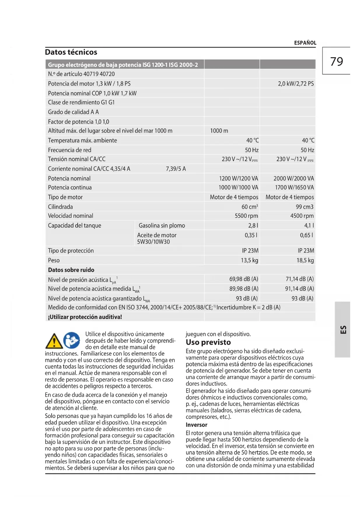 Datos técnicos Grupo electrógeno de baja potencia ISG 1200-1 ISG 2000-2 N.º de artículo 40719 40720 Potencia del motor 1,3 kW / 1,8 PS 2,0 kW/2,72 PS Potencia nominal COP 1,0 kW 1,7 kW Clase de rendimiento G1 G1 Grado de calidad A A Factor de potencia 1,0 1,0 Altitud máx. del lugar sobre el nivel del mar 1000 m 1000 m Temperatura máx. ambiente 40 °C 40 °C Frecuencia de red 50 Hz 50 Hz Tensión nominal CA/CC 230 V ~/12 V 230 V ~/12 V Corriente nominal CA/CC 4,35/4 A 7,39/5 A Potencia nominal 1200 W/1200 VA 2000 W/2000 VA Potencia continua 1000 W/1000 VA 1700 W/1650 VA Tipo de motor Motor de 4 tiempos Motor de 4 tiempos Cilindrada 60 cm