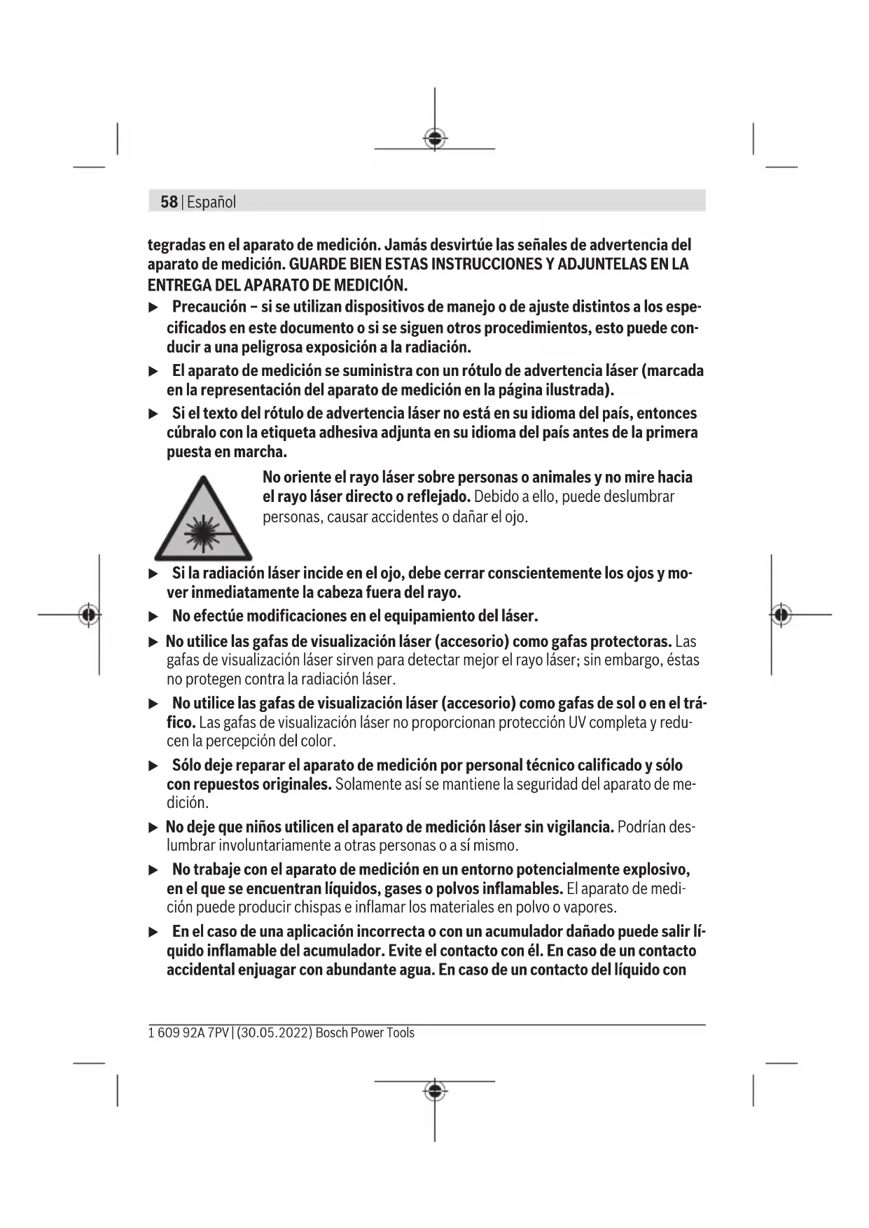 Siempre sustituya todas las pilas o acumuladores al mismo tiempo. Solamente utili- ce pilas o acumuladores del mismo fabricante e igual capacidad. 1 609 92A 7PV | (30.05.2022) Bosch Power ToolsEspañol | 65 Observe en ello la polaridad correcta conforme a la representación en el lado inte- rior del compartimento de pilas. u Retire las pilas o los acumuladores del aparato de medición, si no va a utilizarlo durante un periodo prolongado. Tras un tiempo de almacenaje prolongado, las pilas y los acumuladores se pueden llegar a corroer o autodescargar. Acumulador de iones de litio