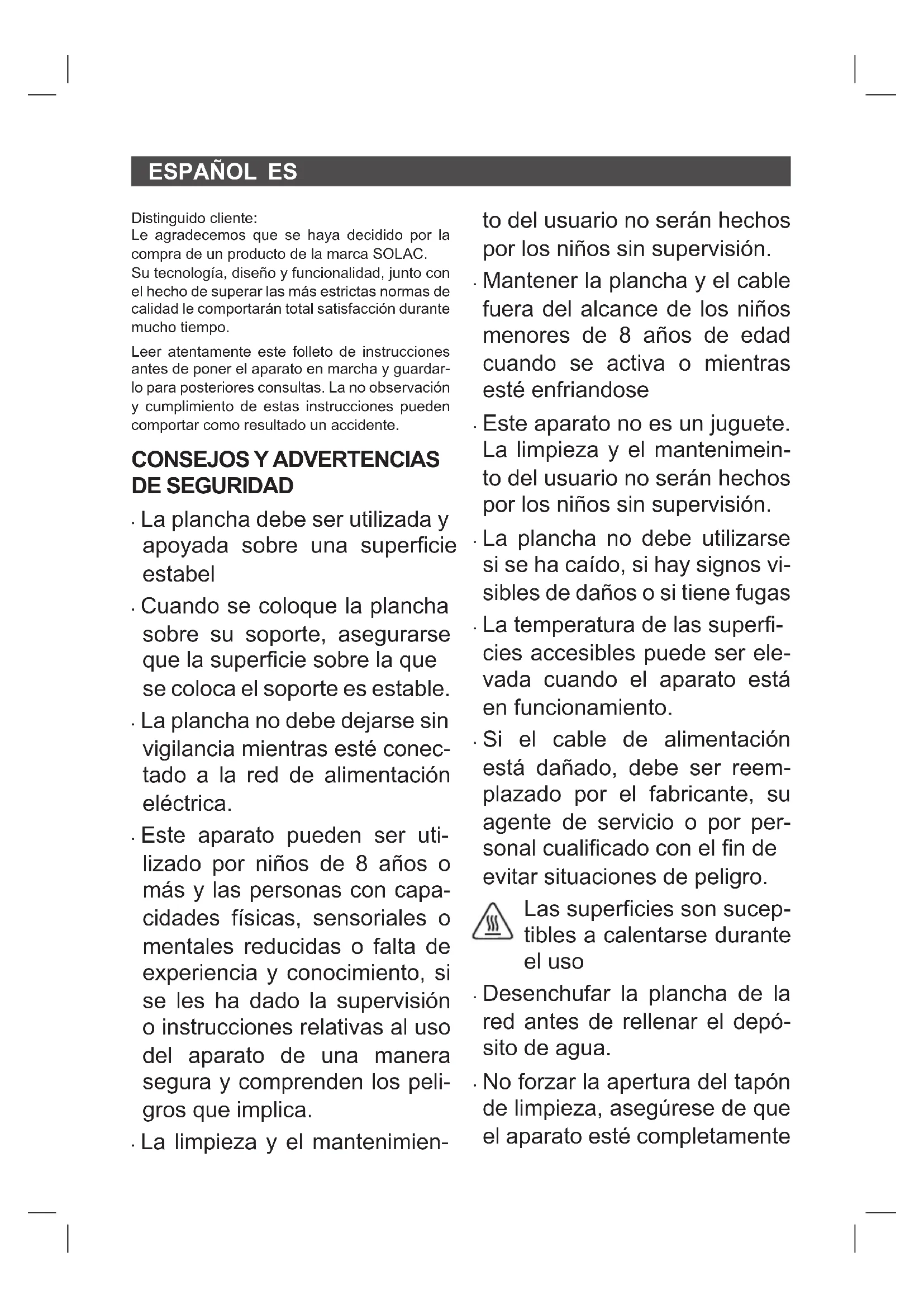 - El producto está exento de concentraciones de sustancias que se puedan considerar da- ñinas para el medio ambiente. Este símbolo signica que si desea deshacerse del producto, una vez transcurrida la vida del mismo, debe depositarlo por los me- dios adecuados a manos de un gestor de residuos autorizado para la recogida selectiva de Residuos de Aparatos Eléctricos y Electró- nicos (RAEE). Este símbolo indica que la supercie pue- de calentarse durante el uso. Este aparato cumple con la Directiva 2014/35/ EU de Baja Tensión, con la Directiva 2014/30/ EU de Compatibilidad Electromagnética, con la Directiva 2011/65/EU sobre restricciones a la utilización de determinadas sustancias peligro- sas en aparatos eléctricos y electrónicos y con la Directiva 2009/125/EC sobre los requisitos de diseño ecológico aplicable a los productos rela- cionados con la energía.ENGLISH EN Dear customer, Many thanks for choosing to purchase a SOLAC brand product. Thanks to its technology, design and operation and the fact that it exceeds the strictest quality standards, a fully satisfactory use and long pro- duct life can be assured. Read these instructions carefully before swit- ching on the appliance and keep them for future reference. Failure to follow and observe these instructions could lead to an accident.
