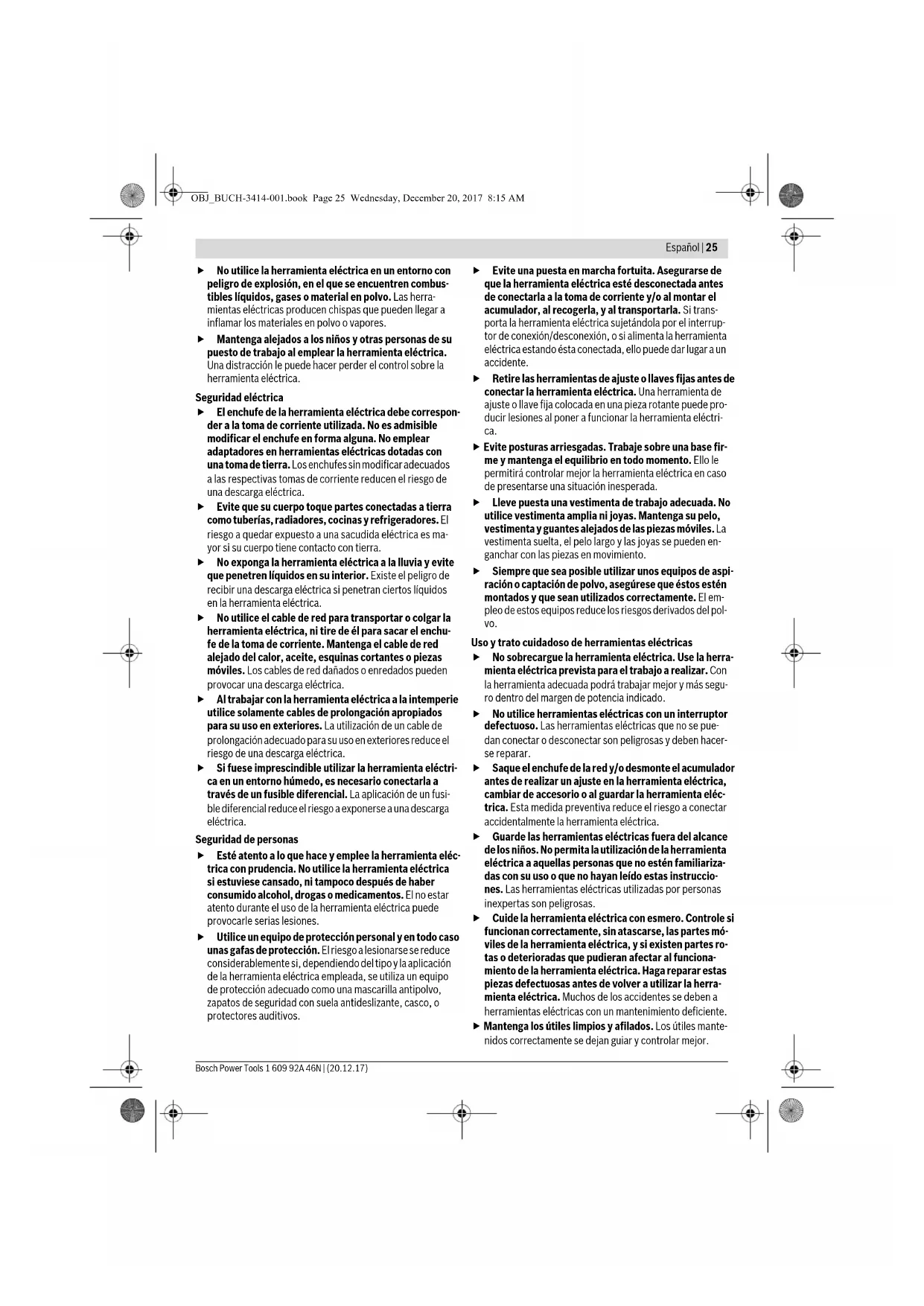 Rosca del husillo M 14 Longitud del husillo, máx. mm 31 Alojamiento del útil mm 20 Grosor del disco de amolar, máx. mm 32 Diámetro máximo de la muela mm 125 Estos datos son válidos para una tensión nominal de [U] 230 V. Los va-lores pueden variar para otras tensiones y en ejecuciones específicas para ciertos países.Los procesos de conexión provocan una breve caída de la tensión. Si las condiciones de la red fuesen desfavorables, ello puede llegar a afectar a otros aparatos. En redes con impedancias inferiores a 0,36 ohmios es improbable que lleguen a perturbarse otros aparatos. OBJ_BUCH-3414-001.book Page 28 Wednesday, December 20, 2017 8:15 AMEspañol | 29 Bosch Power Tools 1 609 92A 46N | (20.12.17) Montaje Antes de cualquier manipulación en la herramienta eléctrica, sacar el enchufe de red de la toma de corrien- te. Montaje de los dispositivos de protección Ajuste la caperuza protectora de manera que las chis- pas producidas no sean proyectadas contra Ud. Caperuza protectora para amolar (GGS 8 SH) (ver figura A) Monte la caperuza protectora 2 sobre el cuello del husillo. Adapte la posición de la caperuza protectora 2 a los requeri- mientos del trabajo a realizar. Sujete la caperuza protectora 2 con el tornillo de fijación 13 apretando el mismo con un par mínimo de 10 Nm. Caperuza protectora para amolar (GGS 8 H) (ver figura E) Monte la caperuza protectora 10 sobre el cuello del husillo. Adapte la posición de la caperuza protectora 10 a los requeri- mientos del trabajo a realizar. Fije la caperuza protectora 10 con ambas tuercas de sujeción 18 apretando las mismas con un par mínimo de 10 Nm. Una vez montado el útil cierre la caperuza protectora 10 y apriete ambas tuercas de mariposa. Montaje de los útiles de amolar Las muelas deben girar perfectamente concéntricas. Sustitu- ya aquellas muelas que giren descentradas, o bien, confórme- las con una piedra para rectificar (accesorio opcional). Partiendo de las formas básicas de las muelas es posible con- formarlas de acuerdo a sus requerimientos con la piedra para rectificar. Si utiliza útiles de amolar de fijación a rosca preste atención a que ésta tenga una longitud suficiente para que el extremo del husillo portamuelas 3 no asiente contra el fondo de la misma. GGS 8 SH (ver figura B) – Vaya girando el husillo 3 hasta conseguir que el taladro del husillo 3 quede alineado con las aberturas de la carcasa. Inserte el vástago de sujeción 14 por las aberturas de la carcasa haciéndolo pasar por el taladro del husillo 3. – Afloje la tuerca de fijación 1 con la llave de dos pivotes 15 adjunta, y retire la tuerca. – Limpie el husillo 3 y todas las demás piezas a montar. – Monte la muela y apriete firmemente la tuerca de fijación 1 con la llave de dos pivotes 15. Preste atención a que la muela pueda girar en la caperuza protectora 2 sin rozar en ningún lado. Utilice muelas cónicas solamente en combinación con la caperuza protectora abierta 2 y el sistema de fijación adecuado (tuerca de fijación 1 o tuerca de fijación rápi- da 7 y brida de apoyo 4). GGS 8 H (ver figura F) – Vaya girando el husillo 3 hasta conseguir que el taladro del husillo 3 quede alineado con las aberturas de la carcasa. Inserte el vástago de sujeción 14 por las aberturas de la carcasa haciéndolo pasar por el taladro del husillo 3. – Afloje la tuerca de fijación 8 con la llave fija 19 (entrecaras 24 mm) girándola en sentido contrario a las agujas del re- loj. – Desmonte la brida de apriete 9. – Limpie el husillo 3 y todas las demás piezas a montar. – Monte la muela junto con la brida de apriete 9 y apriete fir- memente la tuerca de fijación 8 con la llave fija 19 (entre- caras 24 mm). Preste atención a que la muela pueda girar en la caperuza protectora 10 sin rozar en ningún lado. Solamente utilice muelas rectas en combinación con la caperuza protectora cerrada 10 y el sistema de suje- ción apropiado (tuerca de fijación 8, brida de apriete 9 y brida de apoyo 11). Cambio de la brida de apoyo (ver figura D) GGS 8 SH Para el montaje de las muelas cónicas emplee la brida de apo- yo 4, la tuerca de fijación 1 y la caperuza protectora abierta 2. Apalanque el anillo elástico 17 con un destornillador para sa- carlo de la ranura del husillo portamuelas 3, y retire la brida de apoyo 4. Monte la brida de apoyo 4 apropiada siguiendo los mismos pasos en orden inverso. GGS 8 H Para el montaje de las muelas rectas emplee la brida de apoyo 11, la tuerca de fijación 8, la brida de apriete 9 y la caperuza protectora cerrada 10. Apalanque el anillo elástico 17 con un destornillador para sa- carlo de la ranura del husillo portamuelas 3, y retire la brida de apoyo 11. Monte la brida de apoyo 11 apropiada siguiendo los mismos pasos en orden inverso. Tuerca de fijación rápida (GGS 8 SH) (ver figura C) Para cambiar de forma sencilla el útil de amolar, sin necesidad de aplicar herramientas auxiliares, puede Ud. emplear a tuer- ca de fijación rápida 7 en lugar de la tuerca de fijación 1. La tuerca de fijación rápida 7 no debe emplearse para sujetar cepillos. Solamente utilice tuercas de fijación rápida 7 sin dañar y en perfecto estado. Al enroscarla, prestar atención a que la cara grabada de la tuerca de fijación rápida 7 no quede orientada hacia el dis- co de amolar; la flecha deberá coincidir además con la marca índice 16. Peso según EPTA-Procedure 01:2014 kg 4,4 Protección contra rearranque