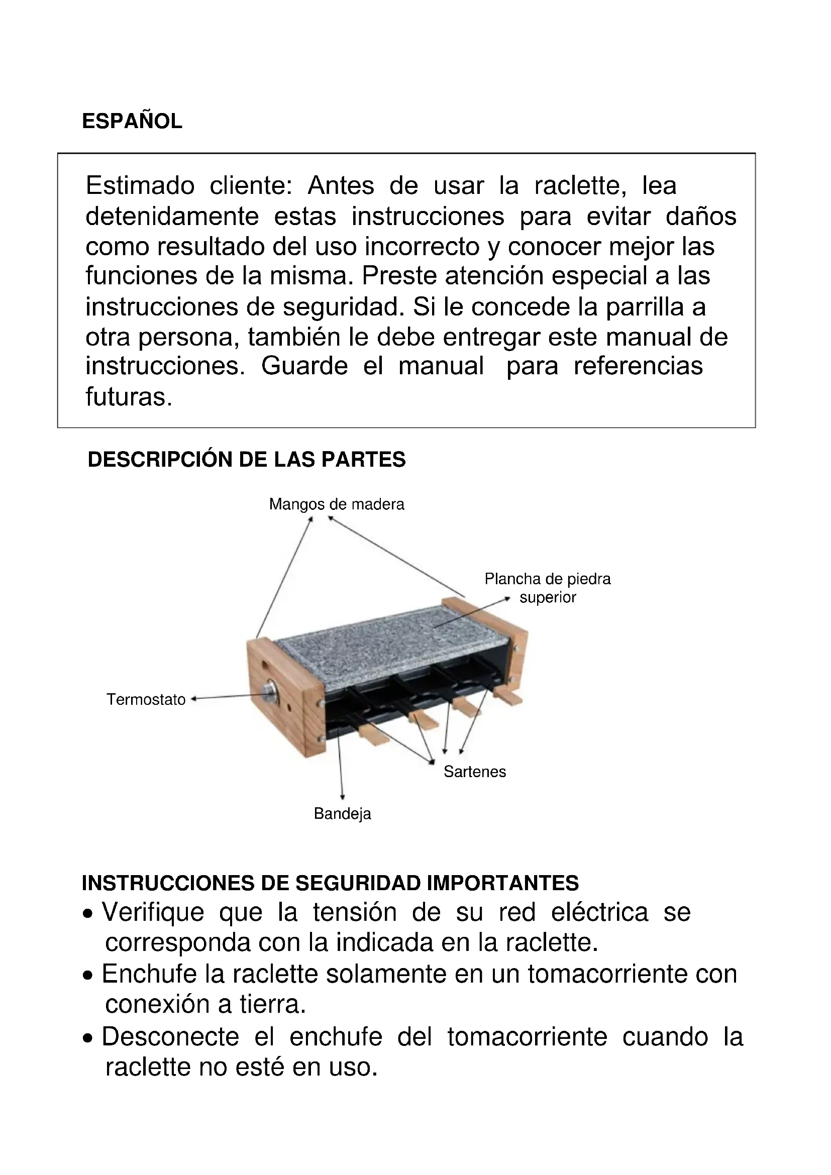 - Desconecte el enchufe del tomacorriente cuando la raclette no esté en uso. Termostato Mangos de madera Plancha de piedra superior Bandeja Sartenes Estimado cliente: Antes de usar la raclette, lea detenidamente estas instrucciones para evitar daños como resultado del uso incorrecto y conocer mejor las funciones de la misma. Preste atención especial a las instrucciones de seguridad. Si le concede la parrilla a otra persona, también le debe entregar este manual de instrucciones. Guarde el manual para referencias futuras.• Cuando utilice un cable de extensión asegúrese de que todo el cable esté desenrollado del carrete. Use únicamente cables de extensión aprobados por el distribuidor/fabricante.
