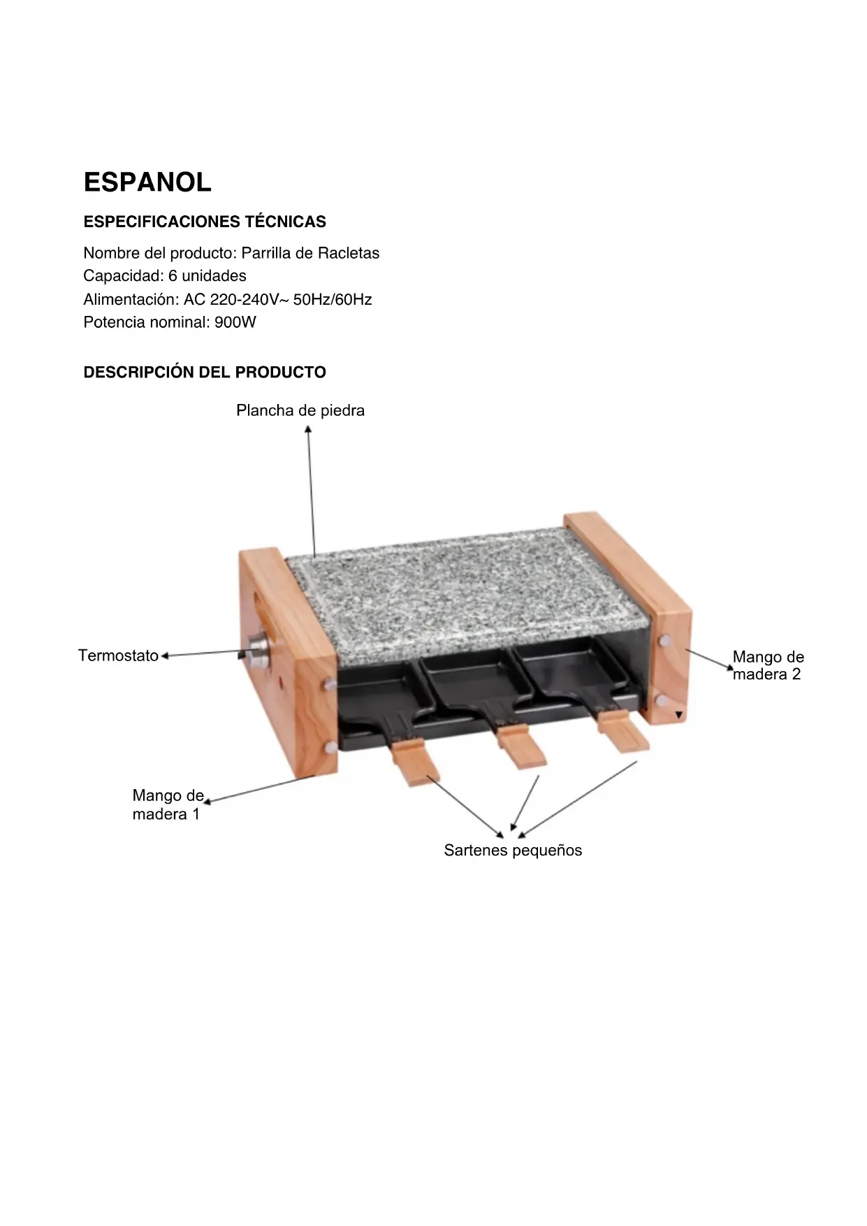 Nombre del producto: Parrilla de Racletas Capacidad: 6 unidades Alimentación: AC 220-240V~ 50Hz/60Hz Potencia nominal: 900W