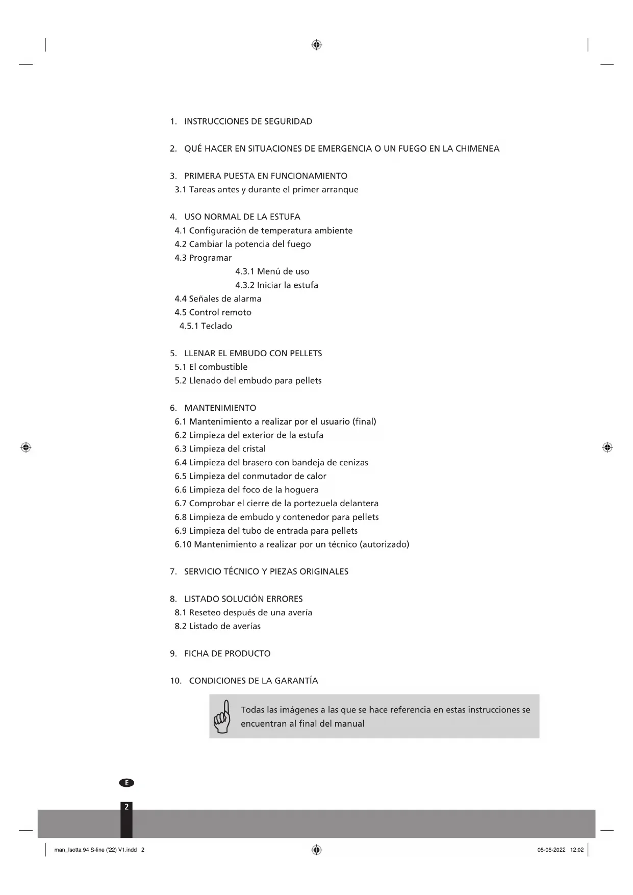 man_Isotta 94 S-line ('22) V1.indd 17man_Isotta 94 S-line ('22) V1.indd 17 05-05-2022 12:0205-05-2022 12:0218 Reencender la estufa No será posible reiniciar la estufa hasta que la temperatura del humo haya bajado del valor Pr13 y haya pasado el tiempo de seguridad Pr38.