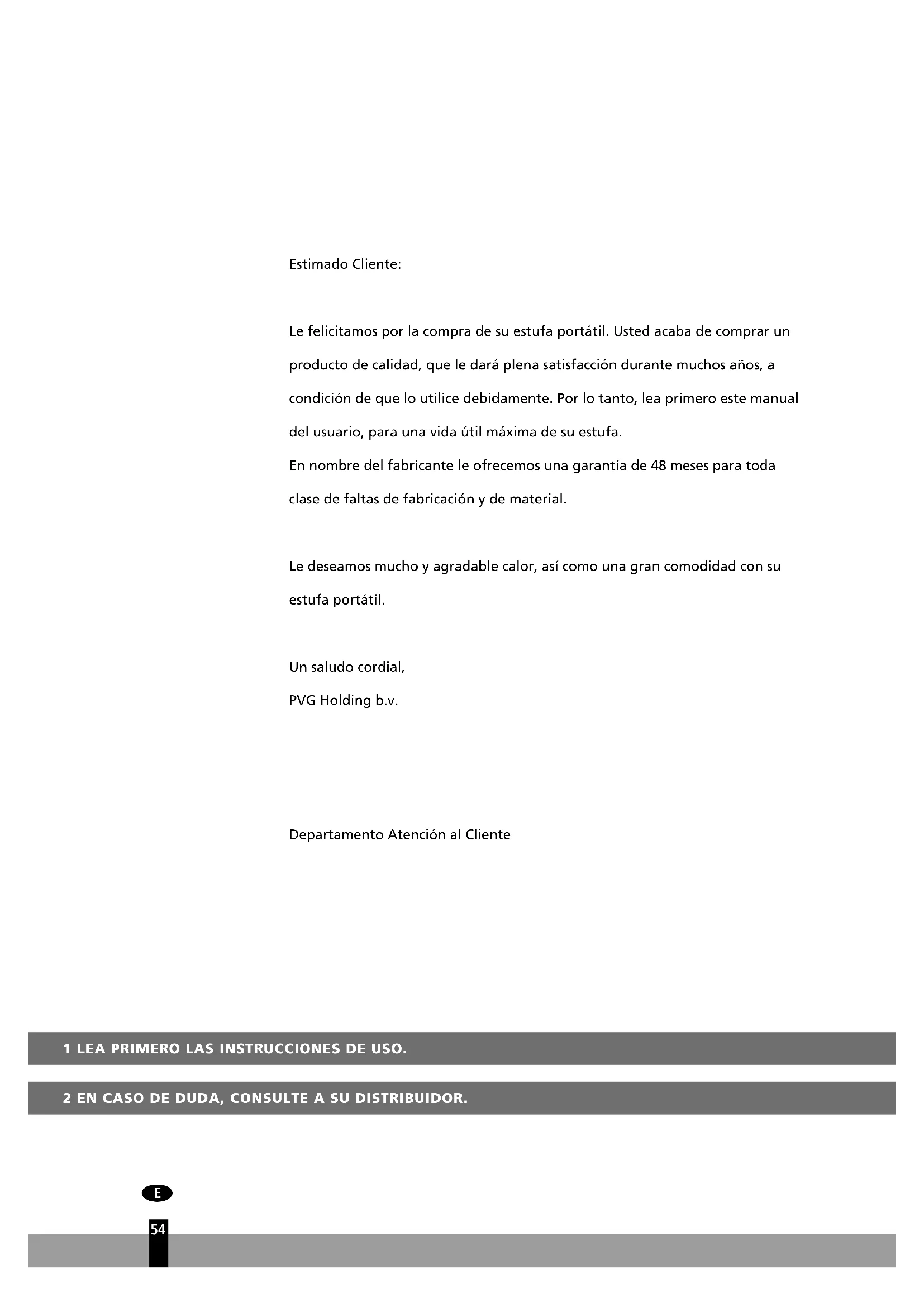 Estimado Cliente: Le felicitamos por la compra de su estufa portátil. Usted acaba de comprar un producto de calidad, que le dará plena satisfacción durante muchos años, a condición de que lo utilice debidamente. Por lo tanto, lea primero este manual del usuario, para una vida útil máxima de su estufa. En nombre del fabricante le ofrecemos una garantía de 48 meses para toda clase de faltas de fabricación y de material. Le deseamos mucho y agradable calor, así como una gran comodidad con su estufa portátil. Un saludo cordial, PVG Holding b.v. Departamento Atención al Cliente 1 LEA PRIMERO LAS INSTRUCCIONES DE USO. 2 EN CASO DE DUDA, CONSULTE A SU DISTRIBUIDOR.