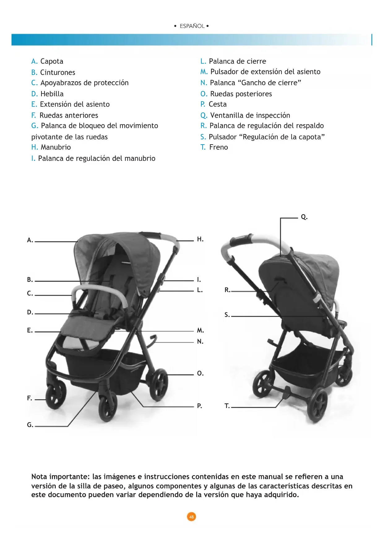 - ESPAÑOL • • ESPAÑOL • Nota importante: las imágenes e instrucciones contenidas en este manual se reeren a una versión de la silla de paseo, algunos componentes y algunas de las características descritas en este documento pueden variar dependiendo de la versión que haya adquirido. A. Capota B. Cinturones C. Apoyabrazos de protección D. Hebilla E. Extensión del asiento F. Ruedas anteriores G. Palanca de bloqueo del movimiento pivotante de las ruedas H. Manubrio