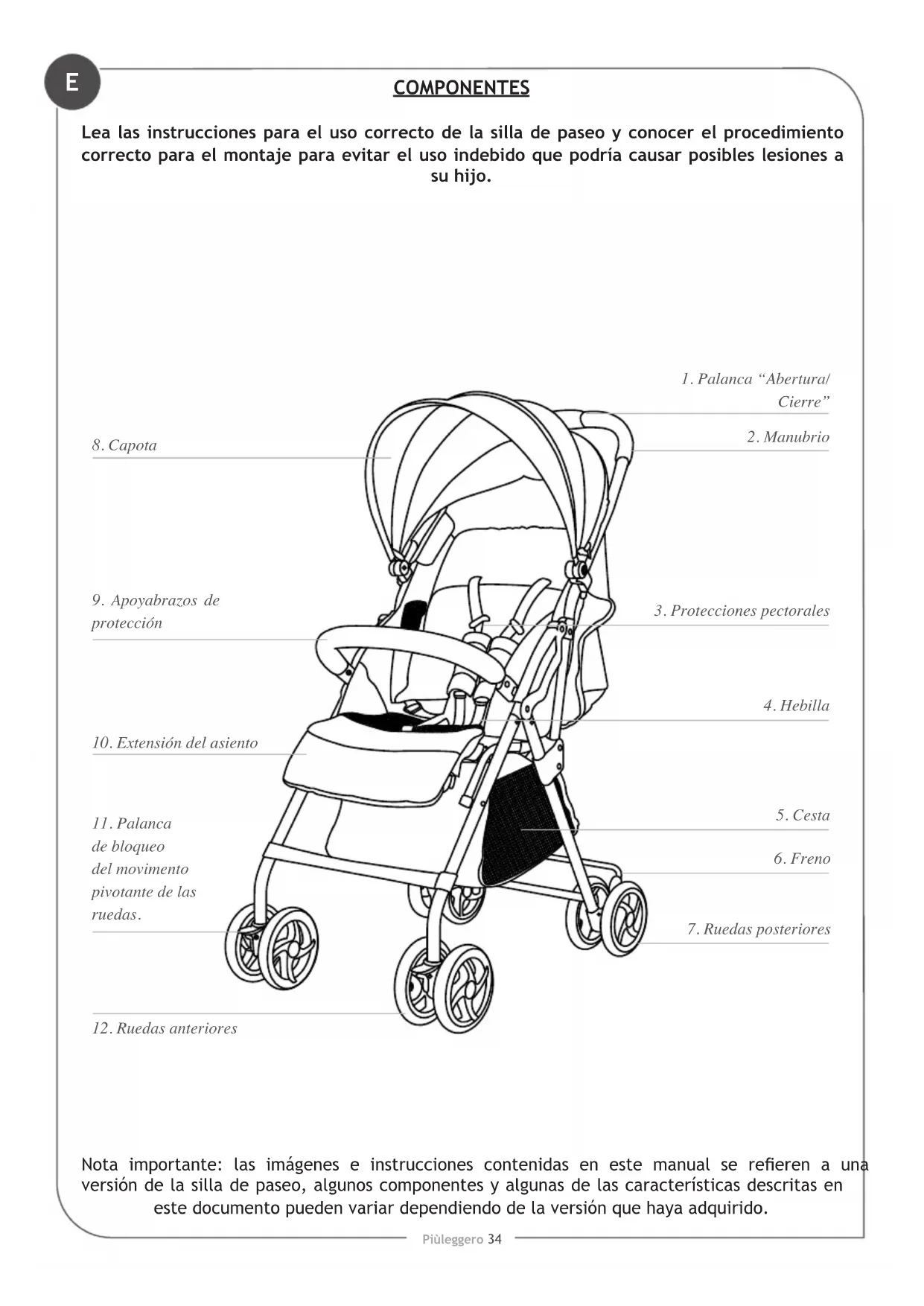 Piùleggero 34 Lea las instrucciones para el uso correcto de la silla de paseo y conocer el procedimiento correcto para el montaje para evitar el uso indebido que podría causar posibles lesiones a su hijo. COMPONENTES
