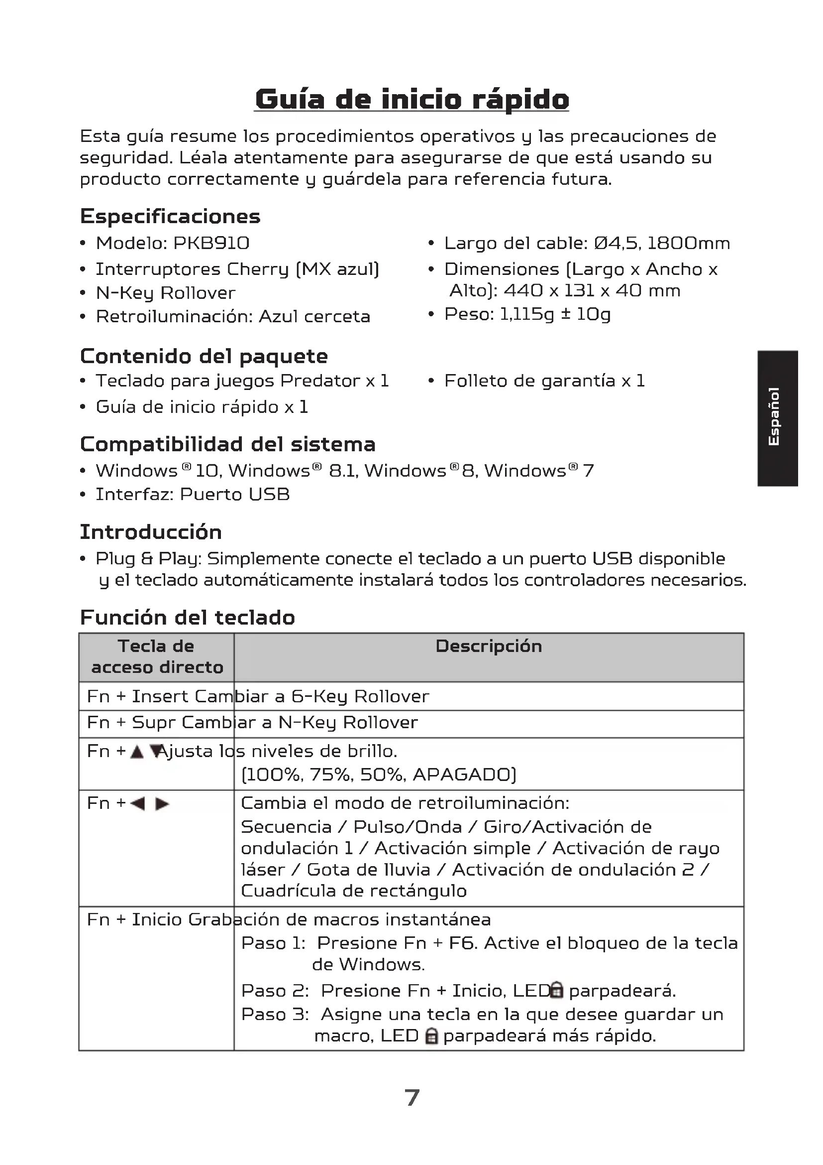 - Plug & Play: Simplemente conecte el teclado a un puerto USB disponible y el teclado automáticamente instalará todos los controladores necesarios. Función del teclado Tecla de acceso directo Descripción Fn + Insert Cambiar a 6-Key Rollover Fn + Supr Cambiar a N-Key Rollover Fn + Ajusta los niveles de brillo. (100%, 75%, 50%, APAGADO) Fn + Cambia el modo de retroiluminación: Secuencia / Pulso/Onda / Giro/Activación de ondulación 1 / Activación simple / Activación de rayo láser / Gota de lluvia / Activación de ondulación 2 / Cuadrícula de rectángulo Fn + Inicio Grabación de macros instantánea Paso 1: Presione Fn + F6. Active el bloqueo de la tecla de Windows. Paso 2: Presione Fn + Inicio, LED parpadeará. Paso 3: Asigne una tecla en la que desee guardar un macro, LED parpadeará más rápido.8 Español Tecla de acceso directo Descripción Paso 4: Escriba tecla en la lista de macros. Paso 5: Presione Fn + Inicio, finalizará la grabación de macros instantánea. El proceso de grabación finalizará si no hay ninguna acción dentro de 20 segundos. Pautas de confort Algunas investigaciones han sugerido que períodos prolongados de movimientos repetitivos; el uso inapropiado de un espacio de funcionamiento, la posición corporal y malos hábitos de trabajo pueden estar asociados con molestias físicas y daños a nervios, tendones y músculos. A continuación encontrará algunas pautas para optimizar el confort y evitar lesiones.